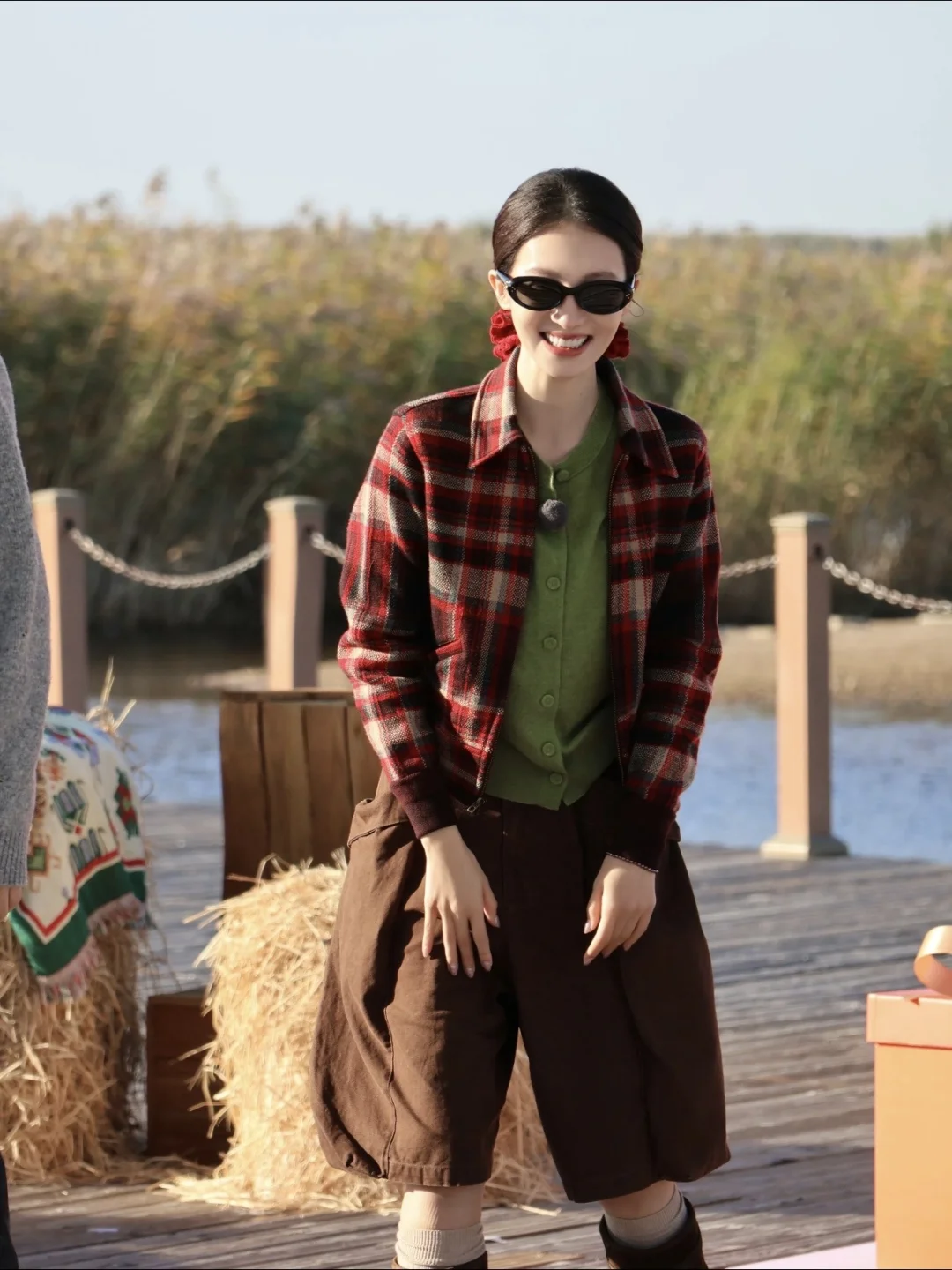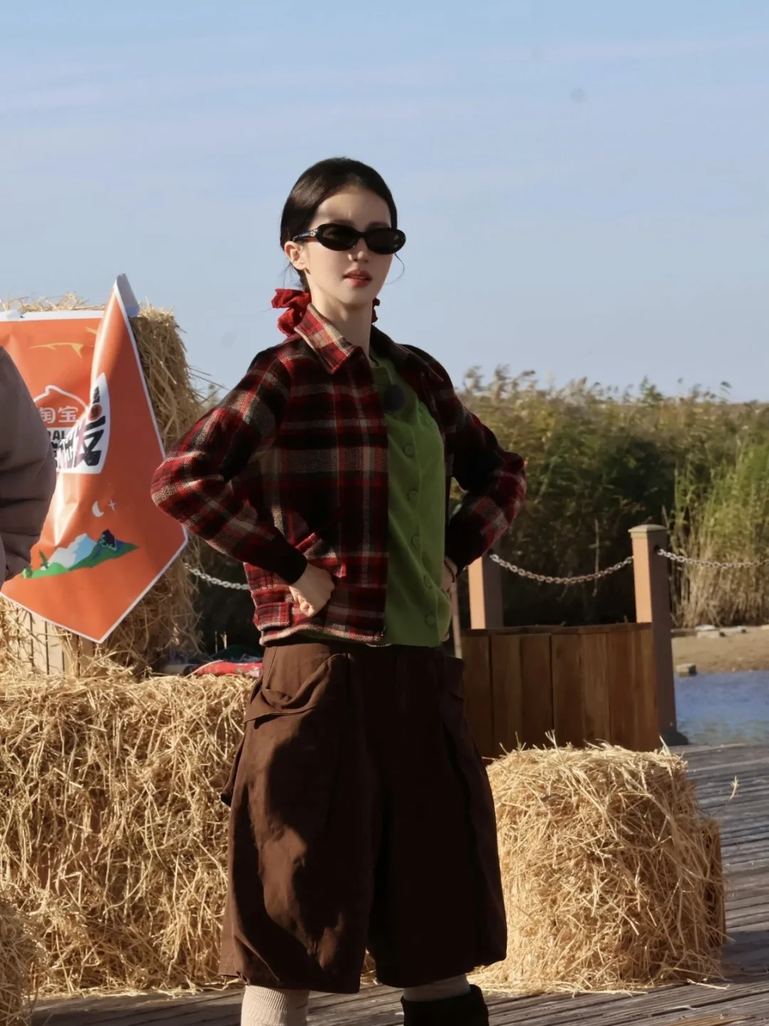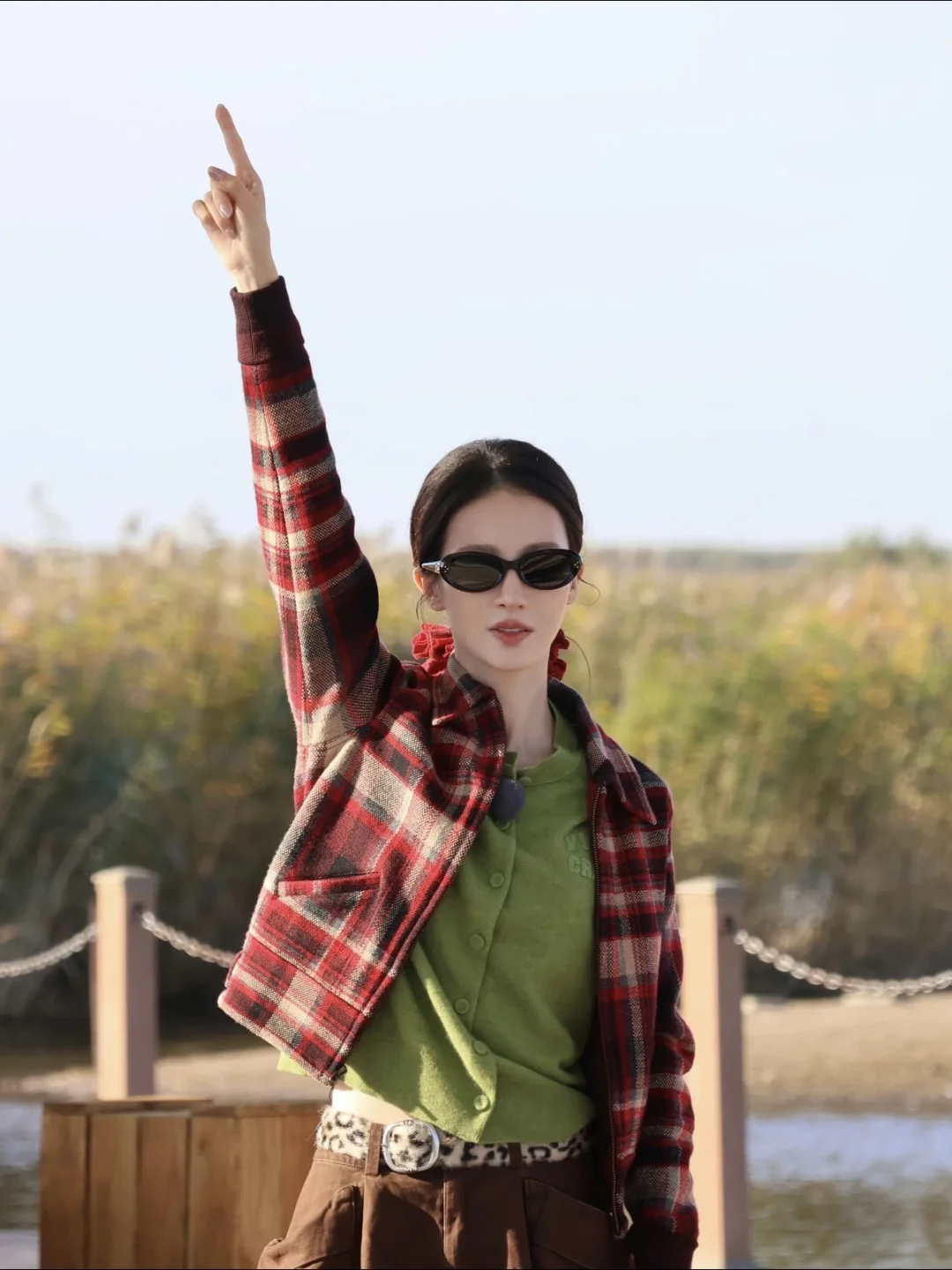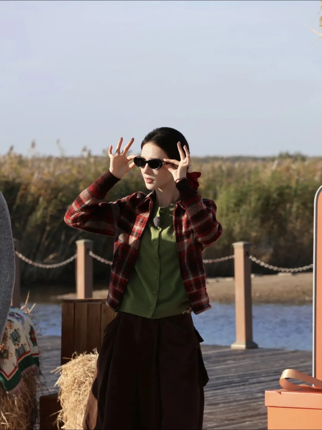 金晨这棕绿配好戳秋冬!格纹+阔腿裤松弛又时髦