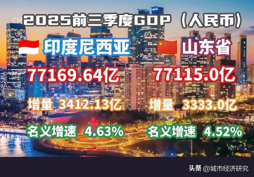 山东省与印度尼西亚2025年前三季度经济数据对比情况,山东前三季度GDP77115亿元人民币,GDP增量3333亿元人民币,印度尼西亚前三季度GDP77169.64亿元人民币,GDP增量3412.13亿元人民币,山东与印度尼西亚前三季度经济总量几乎处于旗鼓相当都为77100多亿元人民币左右的水平,就看山东与印度尼西亚未来一个季度经济发展表现了,网友们觉得今年发展到最后山东与印度尼西亚谁的经济总量将会更高呢?