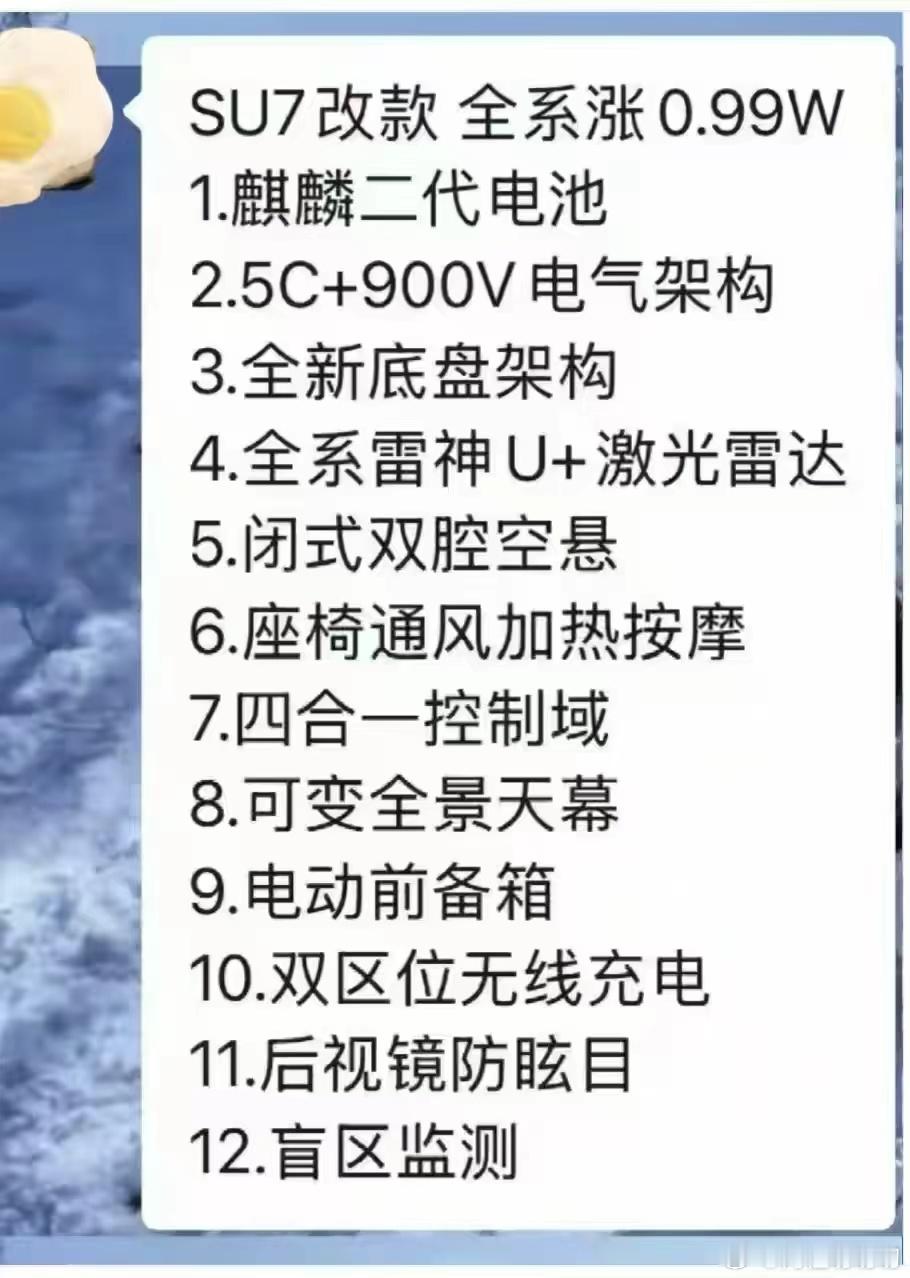小米su7 关于改款的网传图片,不知道背景。不过列的都是已有的配置,除了价格是否上涨以外,其他配置都是会有的。毕竟零部件通用率越高成本越低