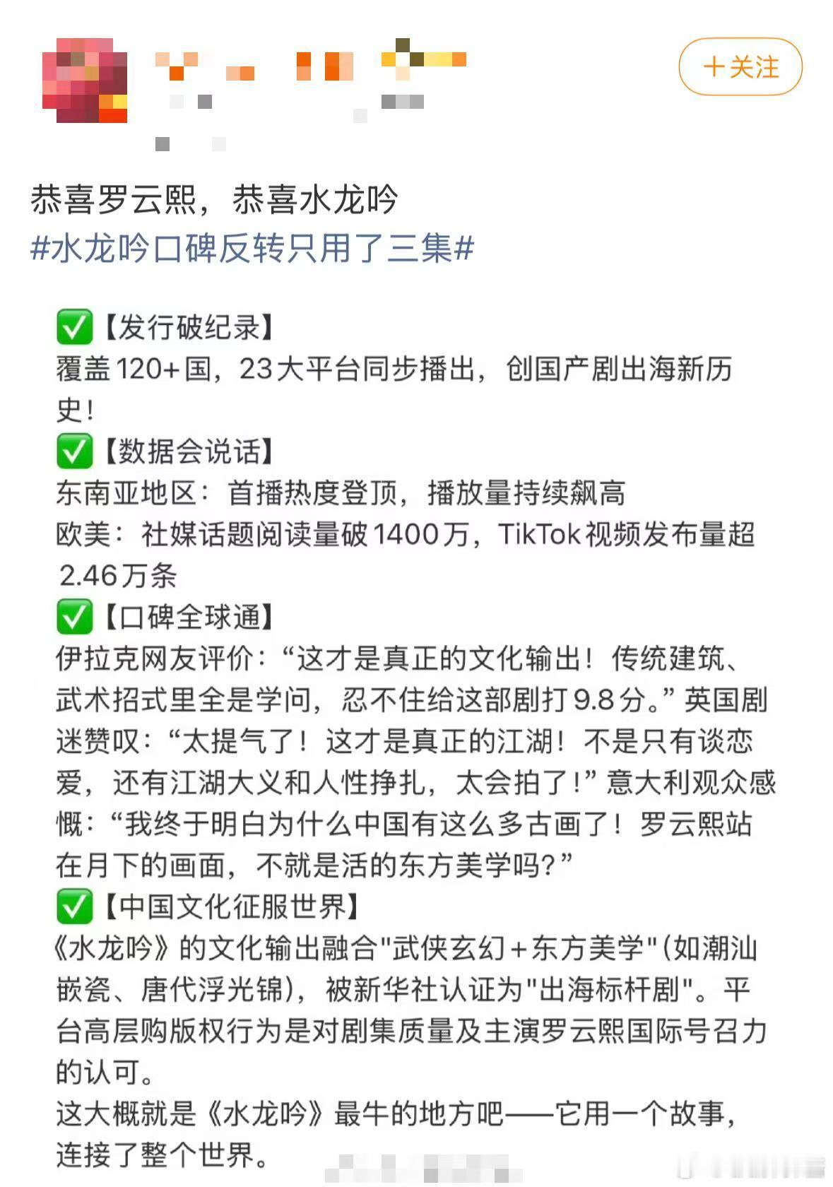 好奇《水龙吟》覆盖120+国家 到底多受欢迎才成标杆[哇][心]这部剧让世界看到国产剧的硬实力,厉害[good]英国剧迷夸有江湖大义,《水龙吟》拍出精髓了