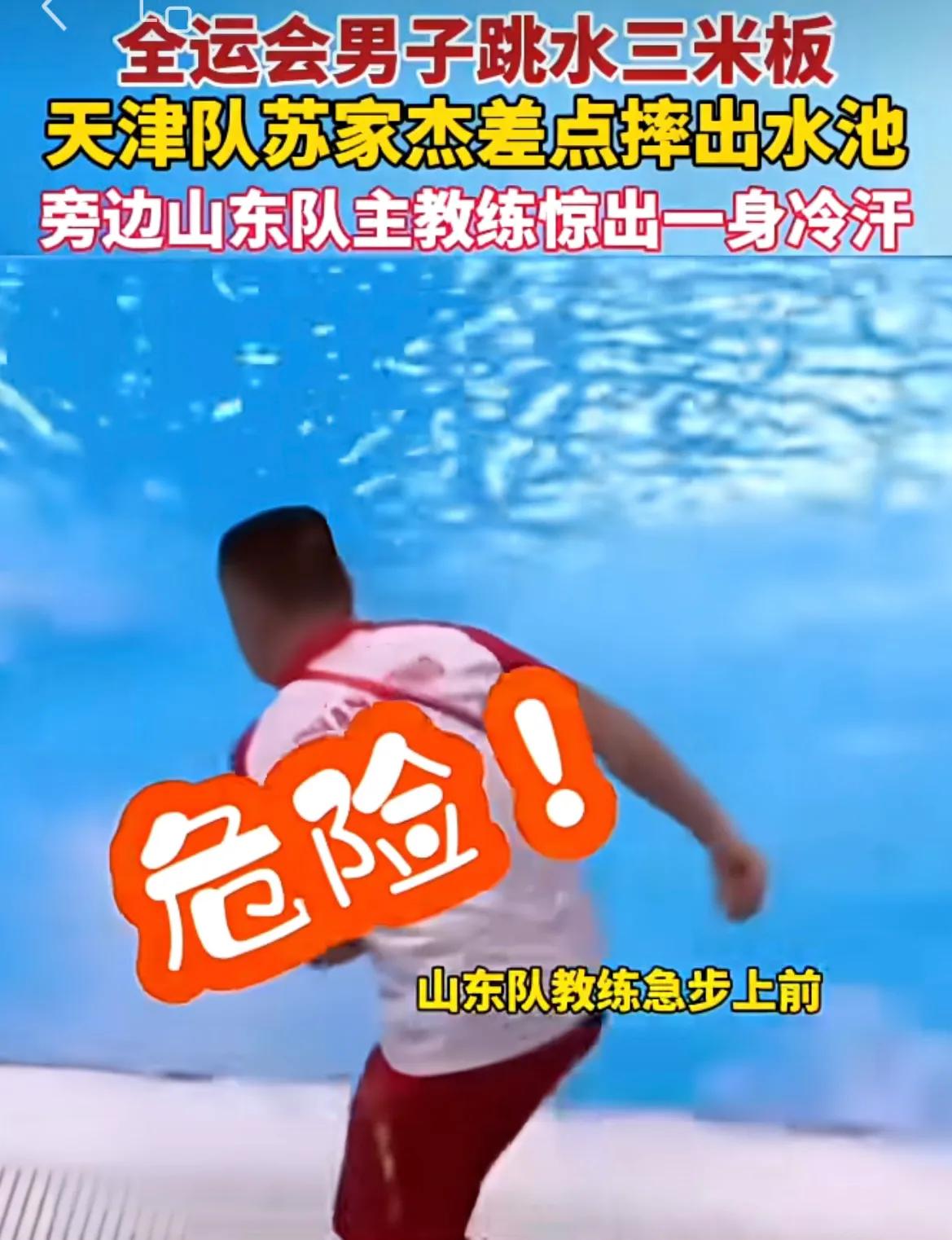全运会男子三米板现场,一位山东队主教练被纷纷点赞,网友称赞他,专业强,反应快,人又好,这教练够爷们儿,能处! 这是一场男子三米板跳水比赛,天津运动员苏家杰在转体时发生失误,坐在旁边的山东队主教练,在小苏起跳的时候,就看出了不对劲,只见他立马起身,一个箭步冲向泳池。 看到小苏有惊无险,山东队主教练才返回座位,继续观看比赛。 这一起一冲,让大家看到山东队主教练的专业和善良。有细心的网友发现,山东队主教练往前冲的时候,是手掌朝外的,说明他已经做好了准备,一旦小苏掉出泳池,他会伸出援手,把小苏接住,或者把他推到泳池里,以避免他受伤。 大家纷纷为山东队的这位主教练点赞,真是好人啊,这也不是自己的队员,还毫不犹豫地冲上来,有人说是本能反应,但正是这个本能,才更显示出了他骨子里的古道热肠。