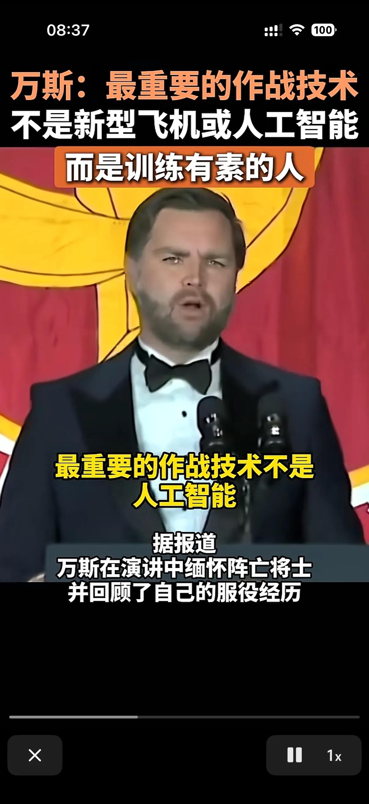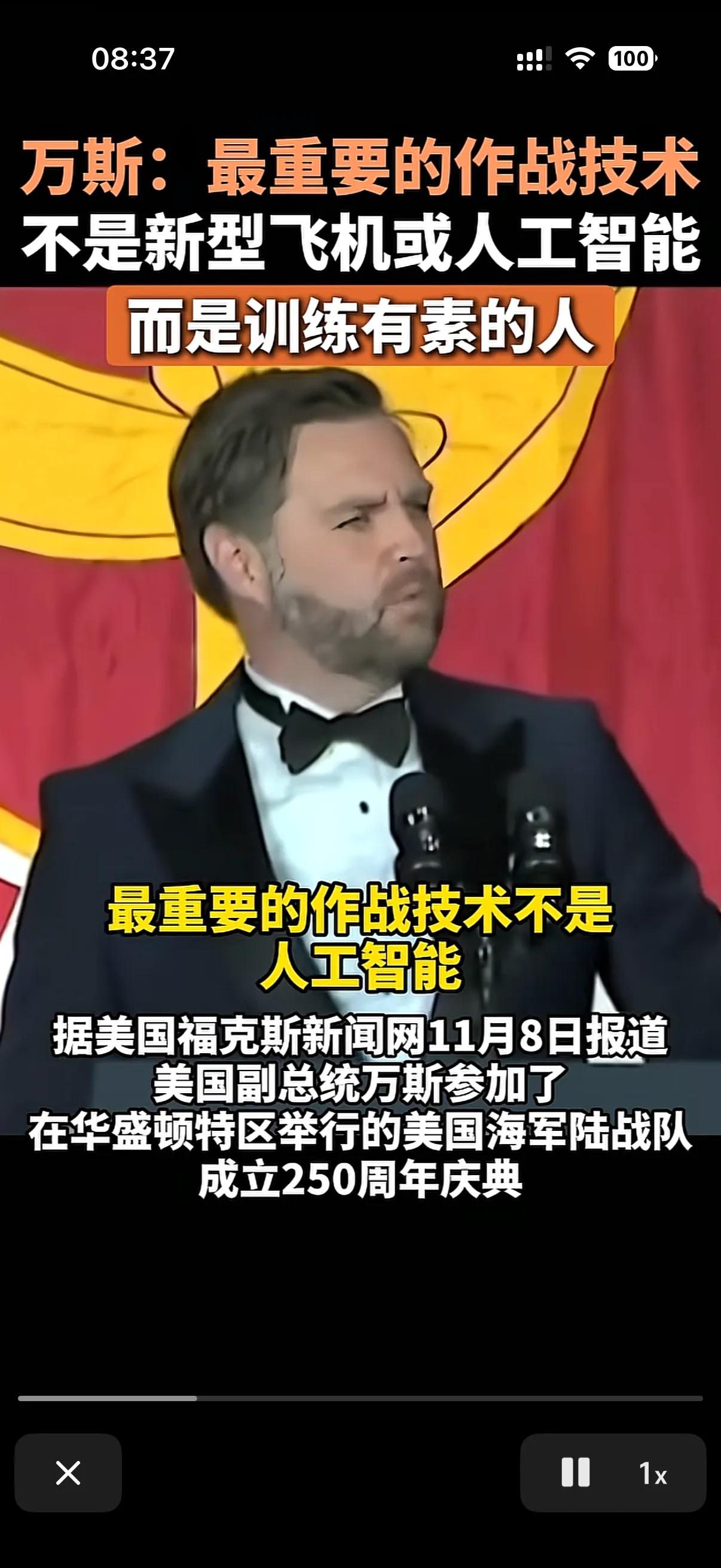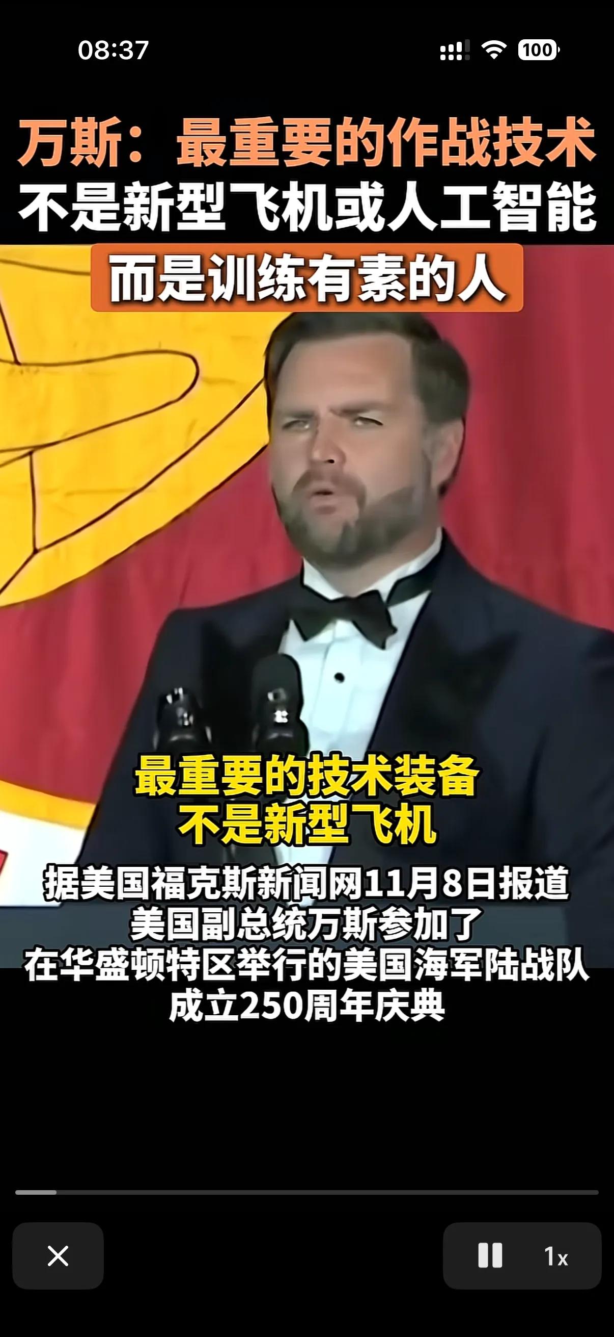 美国副总统万斯称,最重要的不是什么新型飞机或者人工智能! 最重要的是人,是在战场上能够训练有素操作这些武器装备的人,我们要以人为本! 谁能想到这些话是从曾经宣传武器装备最重要的现任美国副总统嘴里说出来的呢! 就在美国副总统万斯参加在华盛顿举行的美国海军陆战队成立的250周年发布了上述的讲话! 不得不说,万斯的讲话十分对海军陆战队的胃口,要知道一直以来海军陆战队都是美国的王牌部队!海军陆战队不但是配备了先进的武器,而且在平时训练有素,完全是特朗普上台以来宣传的军人就应该训练有素的模版! 万斯还特意回顾了自己参加军队服役时的经历!期间万斯还向海军陆战队的士兵承诺,美国领导人不会再在没有明确的任务和无法确保对前线人员提供支持的情况下将士兵派往危险地区! 处处透露着以人为本的理念! 只能说我们都活成了彼此,他说的都是咱们的词!