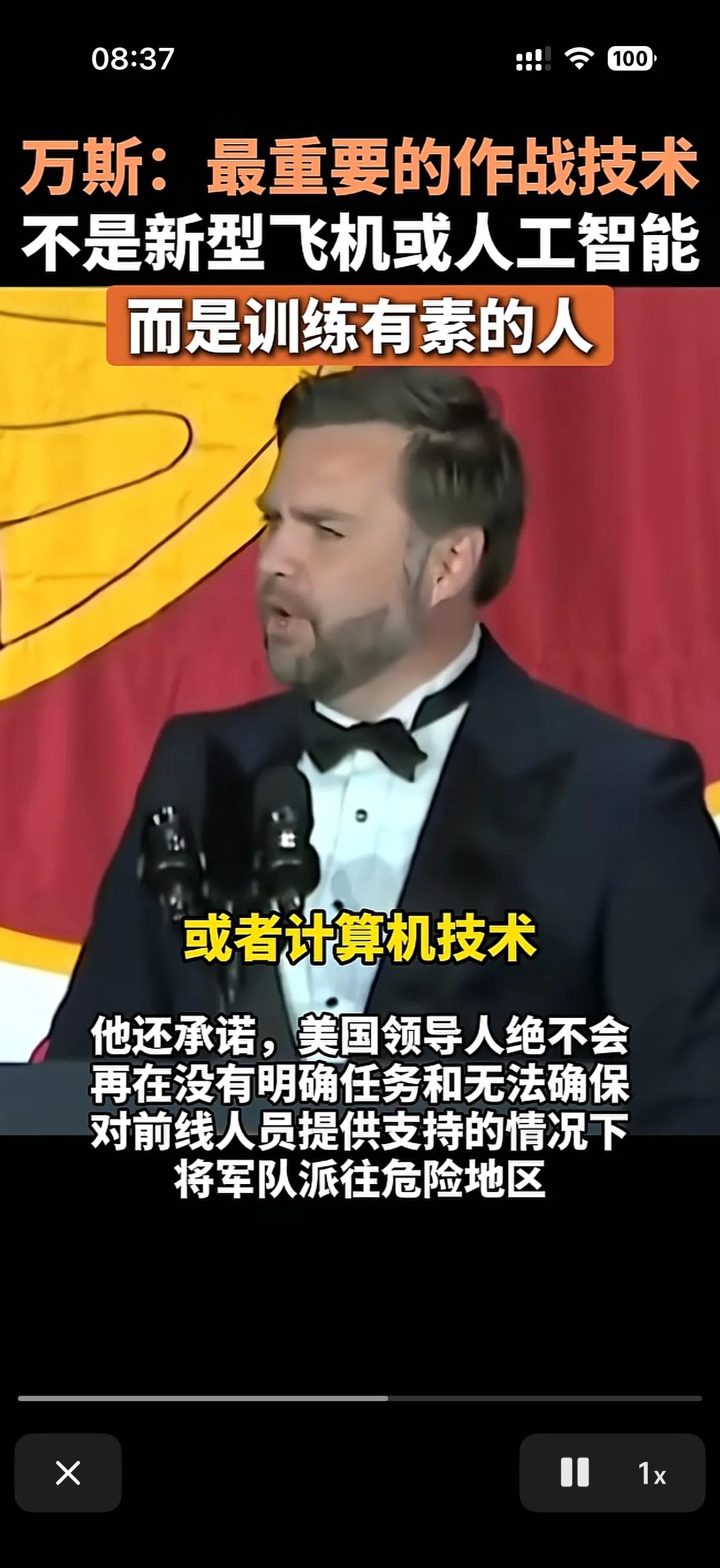 美国副总统万斯称,最重要的不是什么新型飞机或者人工智能! 最重要的是人,是在战场
