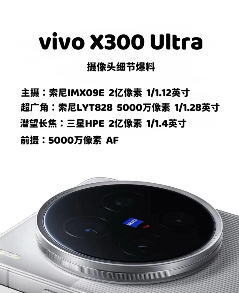 【新机抢先看】vivo X300 Ultra,影像再突破! 主摄 2 亿 IMX09E,1/1.12 英寸超大底,超广 5000 万 LYT828,细节全开,潜望长焦 2 亿 HPE,远近皆清晰,前置 5000 万像素,支持自动对焦。 这次,vivo 把“全焦段旗舰”做到了极致。