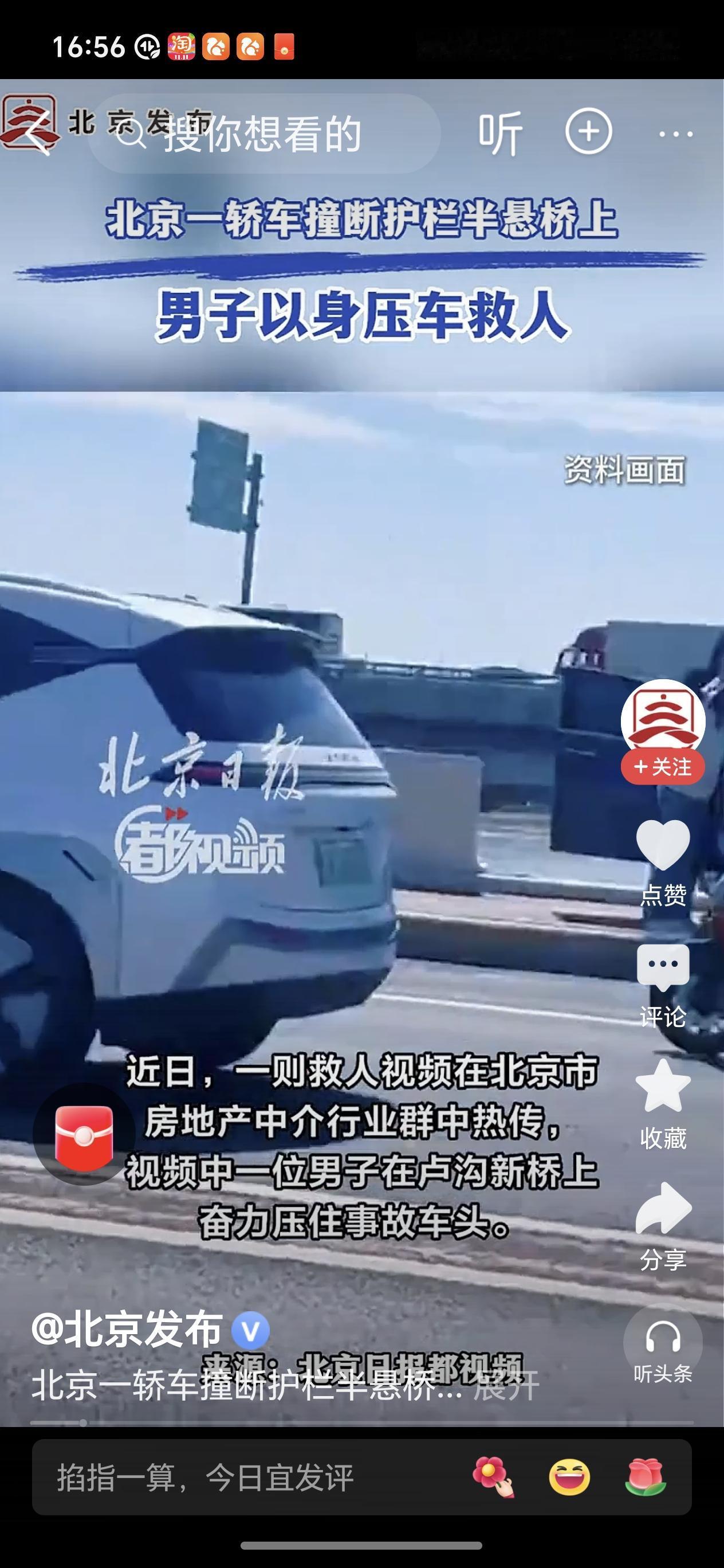 男子压车救人近日北京,一轿车撞断护栏半悬在10米高的桥上,车上坐一男一女吓得脸色苍白,我爱我家某门店一男子正骑车路过,见此情此景第一个跑过去压车救人,并招呼2路人一起施救,三人用体重对抗车子下坠的重力,最终车上两人获救! 救人一命胜造七级浮屠,为救人者点赞,祝福他们好人一生平安!