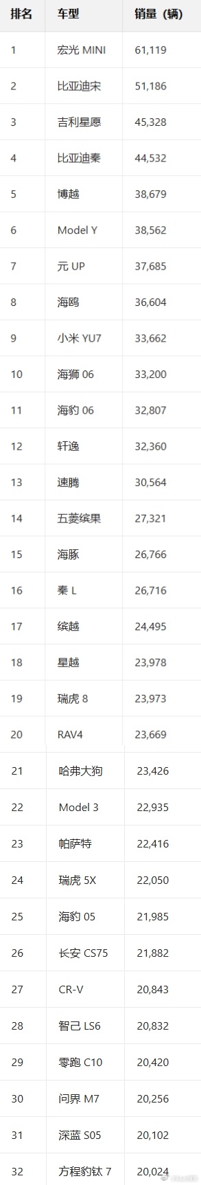 乘联分会2025年10月国内乘用车销量榜显示,五菱宏光MINI以61119辆居首,比亚迪宋51186辆、吉利星愿45328辆、比亚迪秦44532辆分列二至四位,前四名均为自主品牌新能源车型;特斯拉Model Y跌至第六。榜单前15名中传统燃油车仅剩轩逸、速腾等少数,新能源占比超70%。