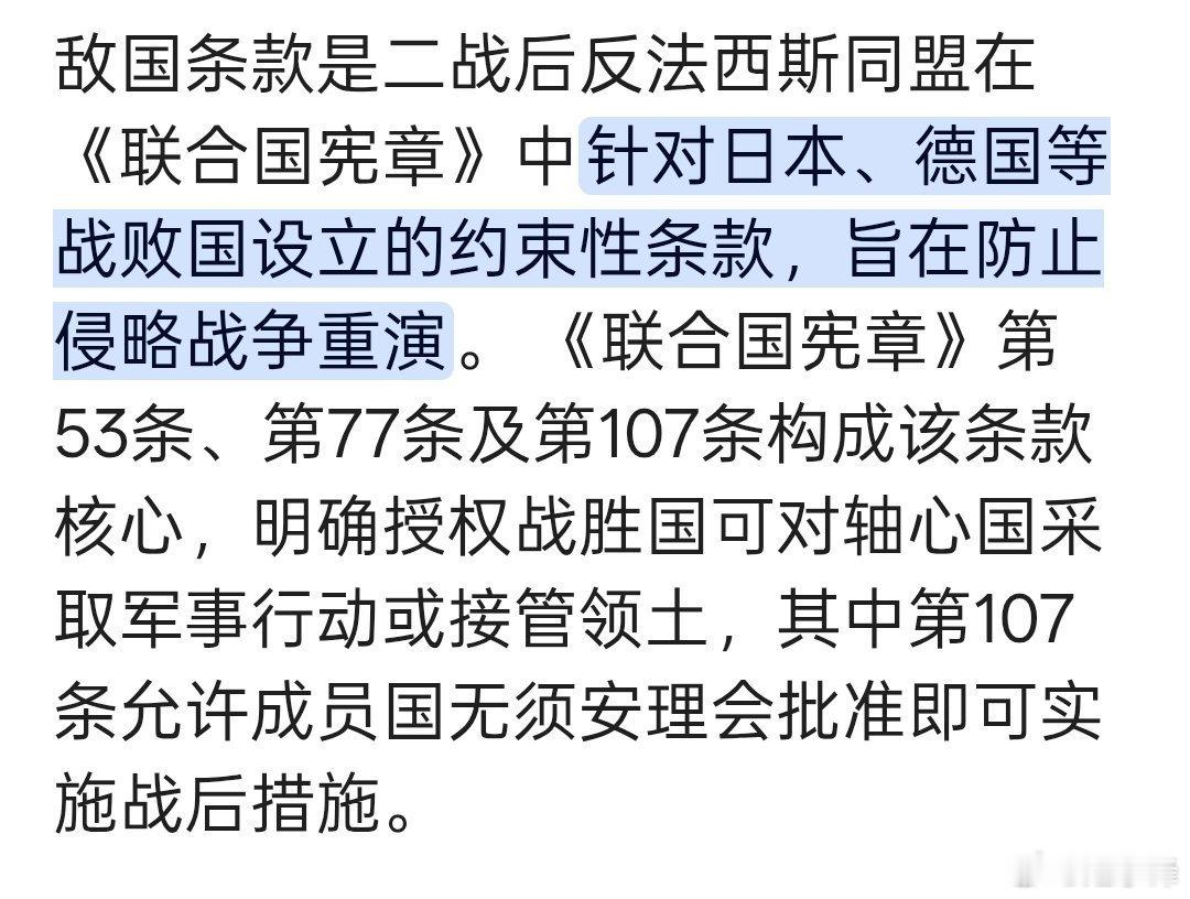 根据《联合国宪章》敌国条款:日本、德国等二战法西斯轴心国,若再有侵略之行为,战胜国无需安理会批准,可直接对其进行军事行动或接管其领土。