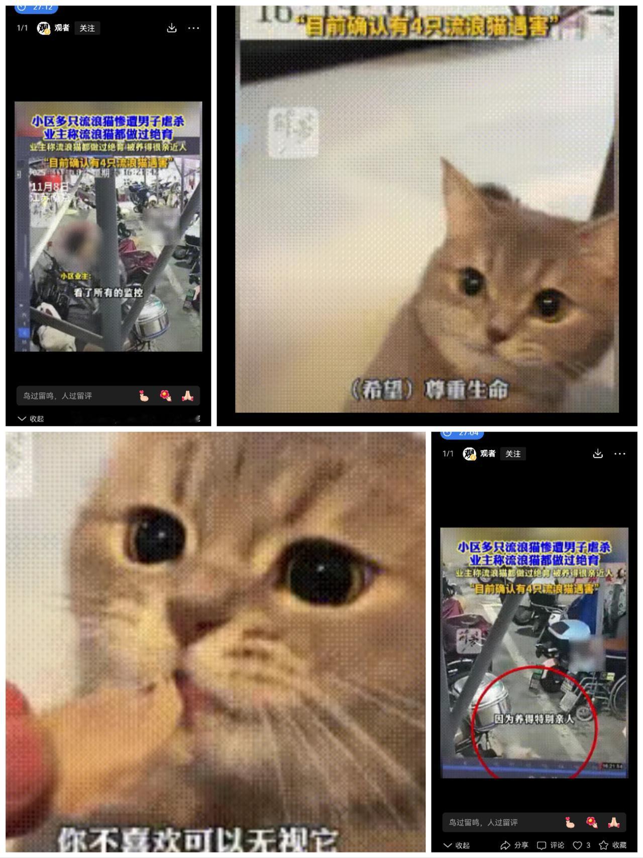 知人知面不知心!南京一名看似斯文的年轻租客,竟在小区内对流浪猫下了毒手。他用火腿肠诱骗四只温顺的猫咪靠近,随后残忍地将它们活活踩死。 完事后竟双手插兜,像个没事人一样扬长而去,只留下地上一抹刺眼的血迹和全小区居民的愤怒。 这些猫是大家看着长大的“团宠”,性格温顺,前一天还有孩子和它们玩耍。更让人脊背发凉的是,有邻居早就察觉这人看猫的眼神不对劲——对毫无反抗之力的小生命都能下此狠手,谁不担心他下一步会做出什么? 这件事真正可怕的点在于,它撕开了平静生活的表象,提醒我们冷漠和残忍可能就潜伏在身边。 当法律难以严惩这种行为时,社区的警觉和人与人之间的守望就成了最重要的防线。 你怎么看?如果你身边出现虐待动物的人,你会怎么做?