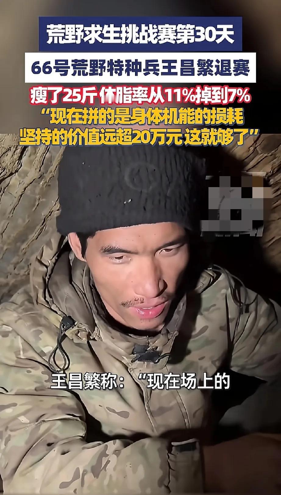 特种兵荒野坚持了30天退出,他不是不能坚持了,他看透了一切,都30天了还没进决赛这个赛制就有问题,场上还有17人,这都是不要命的主。 10月8日,张家界“七星山·骆驼杯”国际极限荒野求生挑战赛第二季正式拉开帷幕,这场号称“中国最严苛荒野生存赛”的赛事,吸引了100名选手参赛。 比赛规则极为苛刻,选手只能带一把柴刀和基础衣物进入野外,禁止携带长款羽绒服、军大衣等保暖衣物,所有补给全靠自己解决,外界不会提供任何物资援助。 在这场残酷的生存挑战中,66号选手王昌繁备受外界关注,作为河南信阳的退役特种兵,他是本届比赛的夺冠热门之一。 凭借多年的野外生存和实战经验,王昌繁在前30天表现非常出色,生存规划和体能储备都远超常人,他的坚持和专业能力也让不少观众为之叫好。 然而让人意外的是,11月7日,也就是比赛第30天,王昌繁选择了主动退出,此时,场上仍有17名选手坚持。 “退出也是一种胜利,这个比赛继续下去,会对人体造成一些不可逆的损伤。”王昌繁在退赛时这样说。 据公开报道,30天里他体重下降了25斤,身体已经到了缺盐的极限,根据赛事规则,每位选手只有200克盐作为基础物资,30天高强度消耗下,身体的各项机能都受到极大挑战。 王昌繁坦言,继续坚持风险太大,损伤可能不可逆,为了健康和尊严,选择了体面离开。 这届“骆驼杯”采用极为严苛的淘汰机制,半决赛阶段,每位选手仅有柴刀和基础衣物,禁止一切多余装备。 比赛分为半决赛和决赛,只有前10名才有资格晋级决赛,奖金则分阶段发放,10天奖2000元,20天6000元,30天1万元,40天1.4万元,之后每10天奖金递增5000元。 最关键的是惩罚条款,如果选手选择继续挑战但未完成当期生存任务,此前所有奖金将被清零。 正是这种规则设计,让不少网友质疑赛事已变成“比惨大赛”,而非真正的极限竞技,有人认为,极端的物资和淘汰机制,正在将选手逼上健康极限,存在安全隐患。 尤其是盐分极度缺乏对人体伤害极大,长期下去甚至有生命危险。 截至30天节点,100名选手只剩下17人,其中包括16名男性和1名女性,这些选手能坚持到现在,绝不是偶然,大多数都具备极强的意志力和适应能力。 赛事方为激励大家继续挑战,将冠军奖金从最初的20万元提升至50万元,但随着时间推移,选手的身体和心理压力也在不断累积。 根据规则,当场上只剩10人时,比赛才会进入决赛阶段。 王昌繁作为退役特种兵,生存能力毋庸置疑,他清楚极限挑战和安全底线之间的分界线,与其在毫无意义的消耗中硬撑,冒着不可逆健康风险坚持到最后,不如及时止损,保全身体和尊严。 赛事的初衷本应是筛选出最强生存者,展现极致能力,但如果淘汰机制过于依赖“自然减员”,缺乏技能考核和合理筛选,反而失去了竞技本身的意义。 其实,从近几年极限生存类赛事的演变趋势来看,很多主办方为了流量和关注度,不断叠加极端规则,试图制造更多“话题性”。 这场比赛还在继续,剩下17名选手的故事仍然在吸引着大量关注,很多人觉得,坚持得越久越厉害,最后的冠军就是“生存之王”。 但事实上,极限挑战的底线应当是安全和健康,有专家建议,未来此类赛事应增加安全评估机制,合理分配基础物资,比如这次的盐就不足,避免过度消耗导致不可逆伤害。 专业特种兵的生存能力是为实战服务,强调高效、安全、有目标,如果比赛变成单纯的“拼意志、拼命长”,赛场生态就已经变味了。 适时退出,有时候比死扛到底更需要勇气和智慧,尤其在极限运动领域,懂得在合适节点体面离场,也是专业素养的一部分,更是对自己、对家人、对社会负责。 当然,极限运动本身就伴随风险,但安全底线不能被无底线突破。赛事主办方有责任在规则设计上进行科学把控,既要体现极限挑战的竞技性,也要保障选手安全。否则,一旦出现重大安全事故,对整个极限运动行业都是致命打击。 再看王昌繁本人,30天的坚持已经足够证明他的实力和意志,他的理性选择,其实是对极限运动精神的最好诠释。 真正的高手,懂得进退有度,不会被盲目坚持绑架,这份清醒,比单纯的“拼命”更值得尊重。 这场张家界的荒野求生挑战还在进行,剩下的17位选手还在和极限较量,无论最终谁能夺冠,或者也选择退出,都值得尊重。 但王昌繁的体面退出,无疑为整个行业敲响了警钟,极限挑战的意义,远不止“最后坚持”,更在于懂得权衡、敬畏自然和保护自己。 希望未来的赛事,能在竞技和安全之间找到更明智的平衡点,给每个热爱极限挑战的人一个既精彩又安全的舞台。 参考信源: 荒野求生第30天,“夺冠热门”河南退伍特种兵退赛!此前已瘦25斤,身体达缺盐极限,将出去找工作 2025-11-07 极目新闻