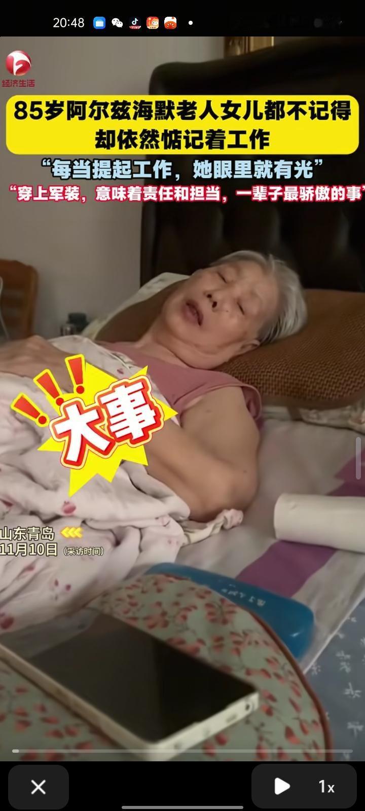 11月10日,山东青岛。85岁患阿尔茨海默症的老人连自己的女儿都不记得,却依然惦记着工作。老人女儿介绍,她15岁当兵,30年的军旅医护专业干部。别的事可能转头就忘了,但每当提起工作的事,她感觉眼里都泛着光。她常说,穿上军装,意味着责任与担当。