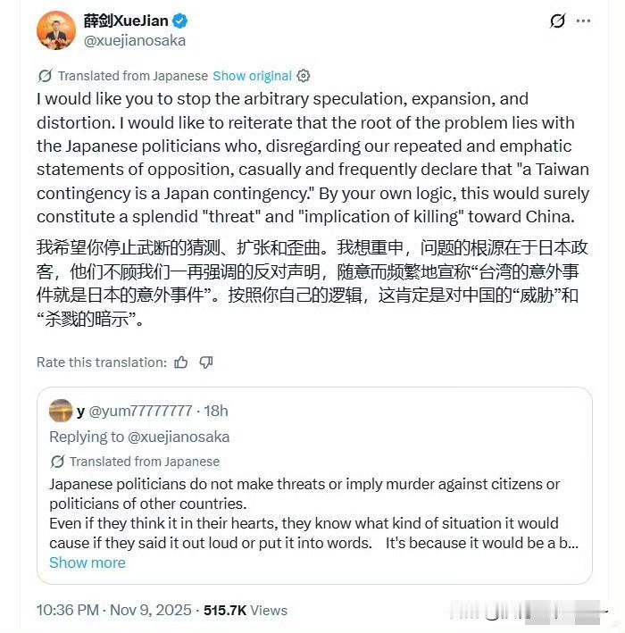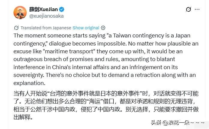 强!顶一个![加油] 就在刚刚,薛剑连续发帖,继续回应日本政客言论!(图二和图三) 其实,这些小日本人啊,自己有错在先,不但不承认错误,不承担自己错误言论产生的责任,还搞得他们好像有理由一样,说白了,高市早苗的涉台言论,日本网友骂的她还轻吗?一个上任没几天就制造危机,给日本带来不安全感的人,都恨不能赶紧让她下台!