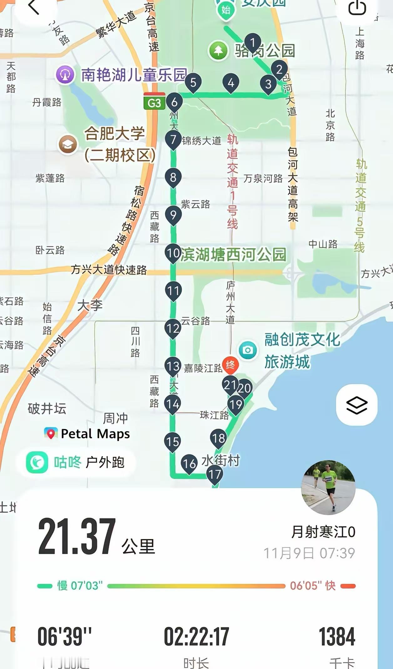 合肥马拉松,半程顺利完赛。我说一句玩笑的话:既然参加马拉松了,就要努力跑出一定的成绩,就当学生的小测试一样,所谓的完赛就好,那为啥花钱花时间呢? 你们跑开心了,封路了,周末我回老家绕了个大圈。 半马能跑出这样的成绩也算不错了,不争名次,重在参与。 慢跑可以,自己舒适就行。