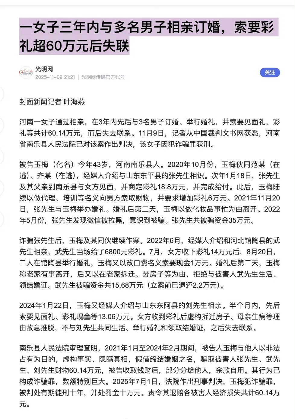 一女子三年内与多名男子相亲订婚,索要彩礼超60万元后失联