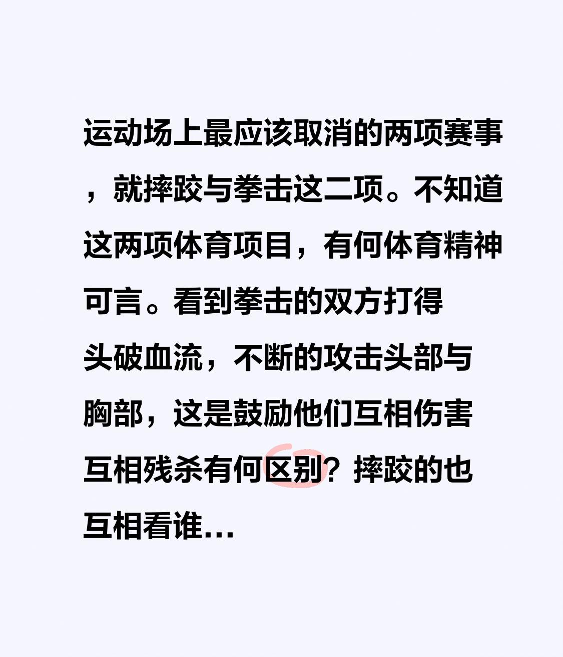 大家认为体育赛事最该取消那些项目? 个人认为,运动场上最该取消的两项赛事,当属摔跤和拳击。 实在难以看出,究竟这两项体育项目它能蕴藏着什么的体育精神呢。 看那拳击场上,双方打得头破血流,持续攻击对方的头部与胸部,甚至失去知觉的都有,问问,这和鼓励他们互相伤害、互相残杀有何分别呢? 而摔跤比赛中,双方比拼谁力气更大,力气小的一方只能遭殃,摔跤项目,是默认年轻人打架斗殴而设置的项目吗? 而且,这两项体育赛事,全然不见什么人类文明素质的体现可言。 有人认同的吗?
