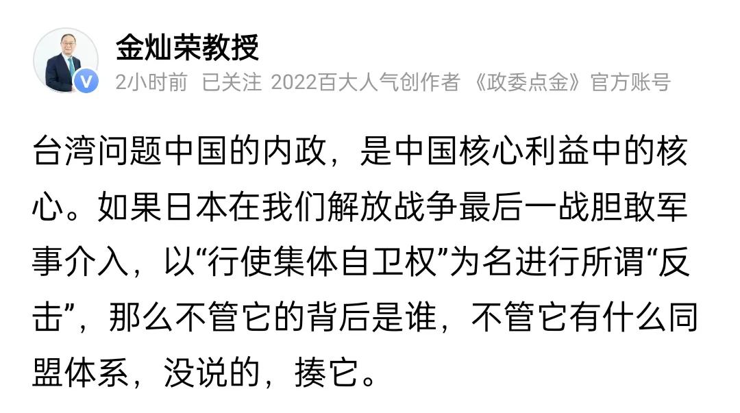 当金灿荣都说出“要揍日本”这样的话的时候,那真的就代表了我们高层对日本的态度了。