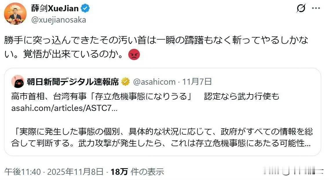 “面对擅自伸过来的肮脏头颅,只有毫不犹豫的斩首!”感觉好久没有听到这样掷地有声的话了。面对挑衅言论,外交官薛剑给了强有力的回击。他们妄谈底线问题,竟然狂妄暗示给自己加戏。可以肯定倭国人会在薛的言论进行疯狂的反击,但我们真不该把这当回事,你们敢表达自己的想法,那我们自然有自己的应对举措。我们有我们的红线,向这样一个不完整国家没有能力进行干预的,他们的叫嚣只能证明他们心虚。我们也应该鼓励我们的外交官,通过各种渠道表达意愿,让世界看到我们的决心,有几声杂声不奇怪。任尔东西南北风,我们自当岿然不动,看看他们的表现也不错。只不过听说薛外交官已经删除了相关文字,或许有更多的外交考虑,但声音已经发出,那些企图介入台海的国家也应该好好掂量掂量了。