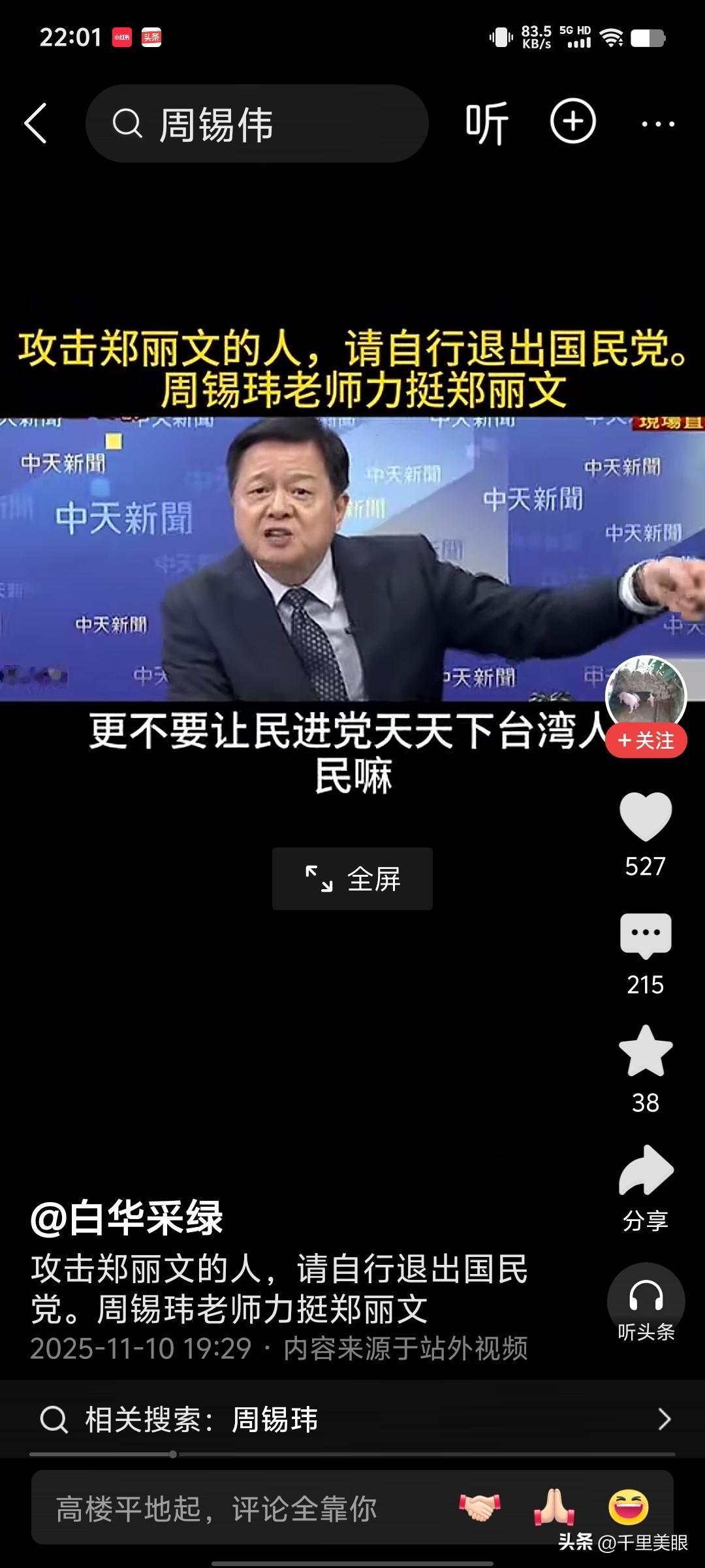 周㻛玮:反对郑丽文的人,是別有用心,请滚出国民党。 周㻛玮在节目中说道:郑丽文祭拜白色恐怖受难者,有不少的国民党跟着民进党起舞,指斥和批评郑丽文,这些人既然不支持自己党主席,那你呆在国民党干什么,还不如滚出国民党! 道不同不相为谋,心不同不必同路; 至始至终坚定支持郑丽文的国民党名嘴就两位,一位前台北县长周㻛玮;一位是前国安副秘书长杨永明。