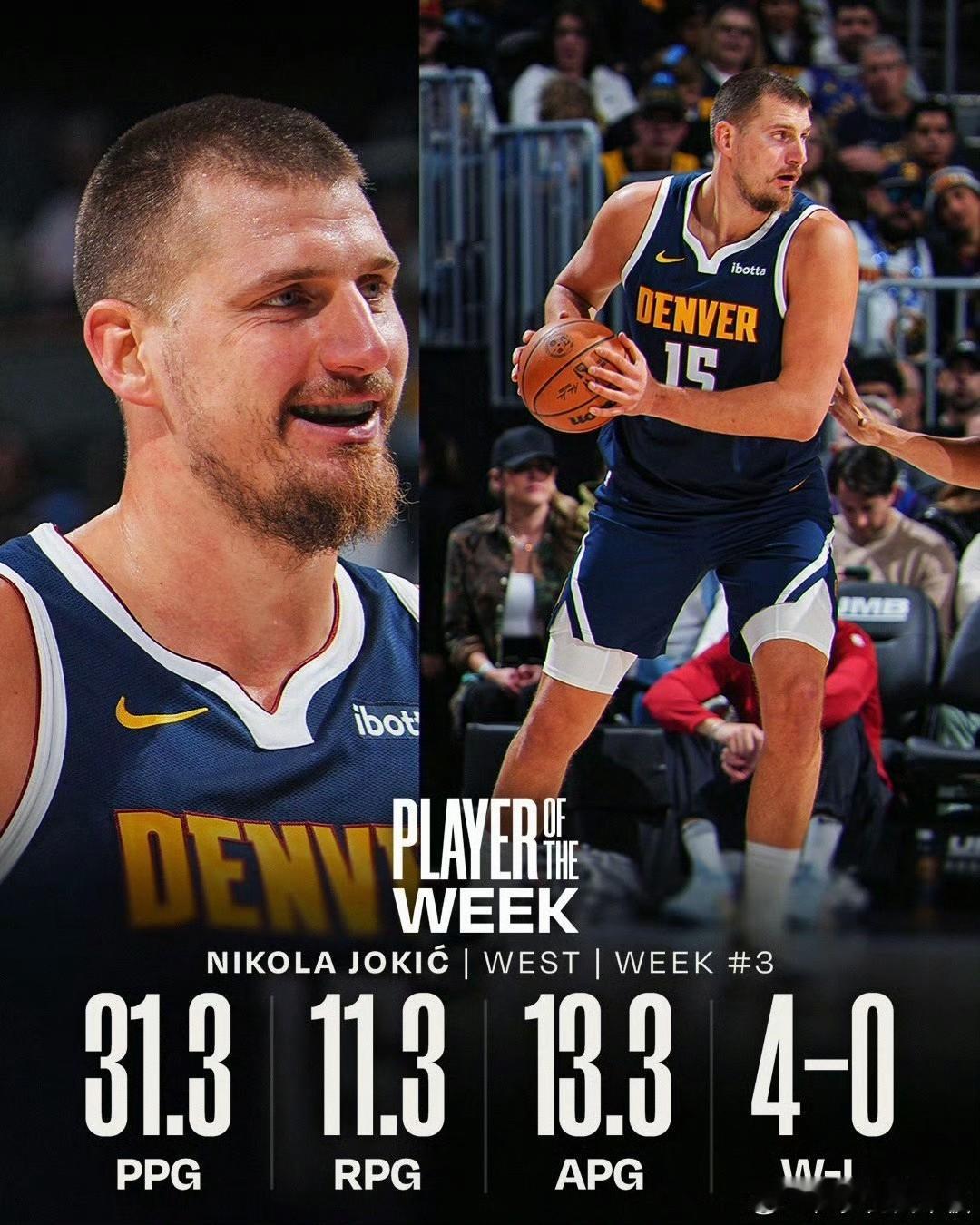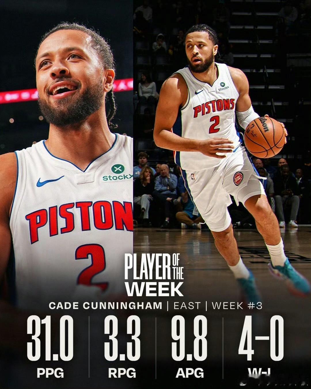 NBA官方:约基奇坎宁安当选上周最佳球员! 今日美国时间周一,按惯例是NBA官方公布上周NBA周最佳球员的时间。最终,活塞队的坎宁安和掘金队的约基奇榜上有名,分别当选。 坎宁安上周率领活塞取得了4胜0负的佳绩,他场均可以得到31分3.3篮板9.8助攻的数据,活塞目前8胜2负高居东部第一! 约基奇也不遑多让,他上周场均可以贡献31.3分11.3篮板13.3助攻的豪华三双数据,带领掘金同样拿到四战全胜的战绩。 他们的入选实至名归,再次恭喜!也希望快船早日摆脱低迷,哈登也能入选周最佳!