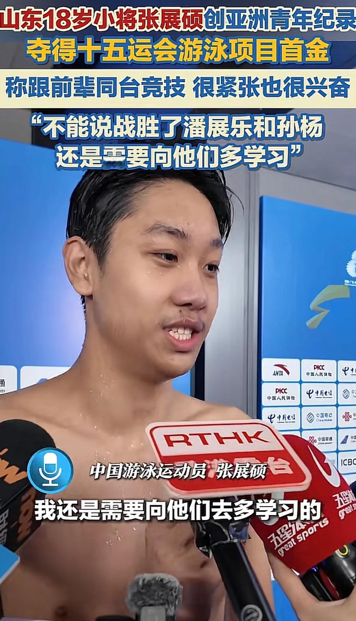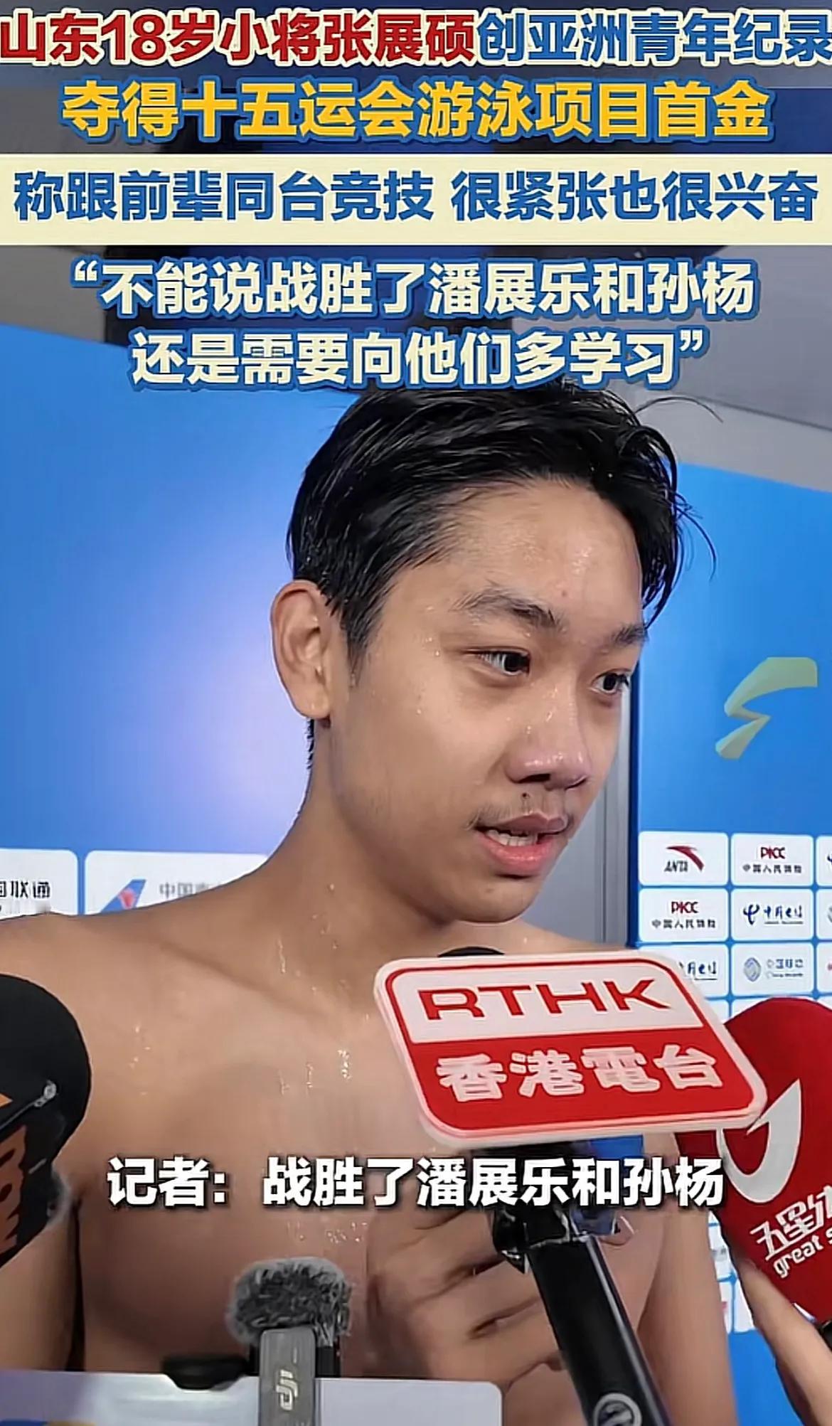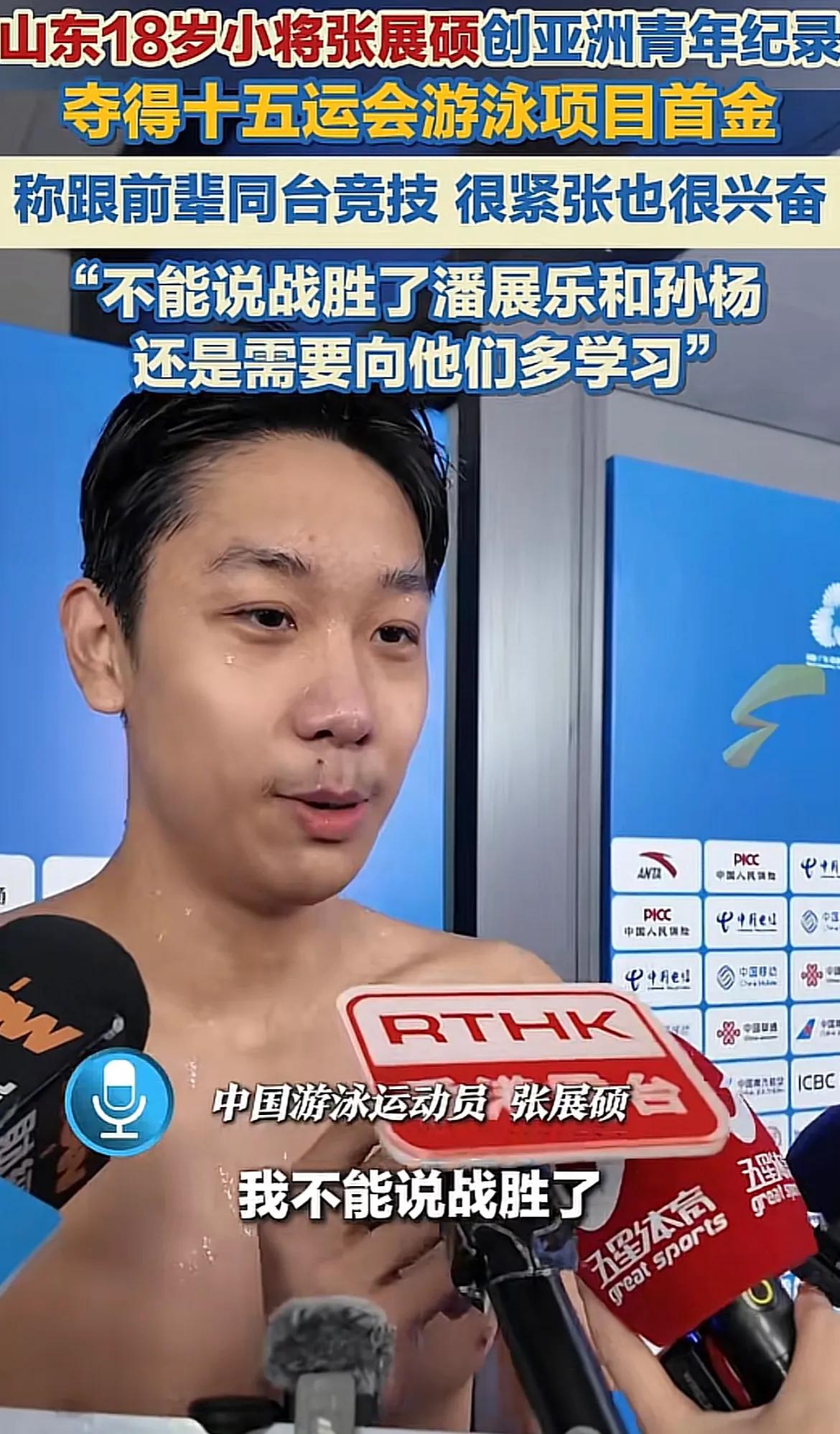 好样的!山东青岛小伙张展硕,在全运400米自由泳夺冠,赛后采访,记者提问挖坑,张展硕高情商回答,赢得全网点赞! 这次比赛,张展硕夺金,潘展乐和孙杨仅列第五和第六名,记者在提问时,问张展硕战胜潘展乐和孙杨之后的感想,张展硕低调回答:不能说战胜,我还是需要向他们去多学习的...... 不得不说,这记者有点挖坑,潘展乐和孙杨都是泳坛名将,她用了战胜这个词,的确有些不妥。 山东小伙张展硕是真有情商啊,立马发现问题,果断表明自己的态度,这两句话说的,谦虚有礼,稳重大气,才18岁就能表现得这么妥帖,着实不容易。 网友纷纷点赞:不愧是考公强省,这回答太标准了!回头可以到大人桌上吃饭了!这回答太有水平了,真不像是18岁的孩子说的...... 应该说,山东人骨子里就谦虚低调,张展硕的回答很山东,其实他的实力很强,2018年,年仅11岁的张展硕,就打破了50米仰泳和200米混合泳的山东省纪录;2023年在全国崭露头角,在400米两个项目夺金。 2024年,张展硕助力中国队,与潘展乐等队友一起,在世锦赛4乘100米和200米,两个接力项目夺冠,实现了我国在该项目零的突破,这是张展硕头一回参加世锦赛,就夺得两金。 当时采访,张展硕就表现的很低调,他说,接力项目,一个人强不是强,是团队的荣誉! 张展硕太棒了!评论区展开了抢人大战,不光是山东各地市抢张展硕,其他省也不甘示弱,恨不能将张展硕抢到手! 我发现,游泳厉害的,名字里都带个展字,潘展乐、张展硕,有网友问,现在改名还来得及吗?