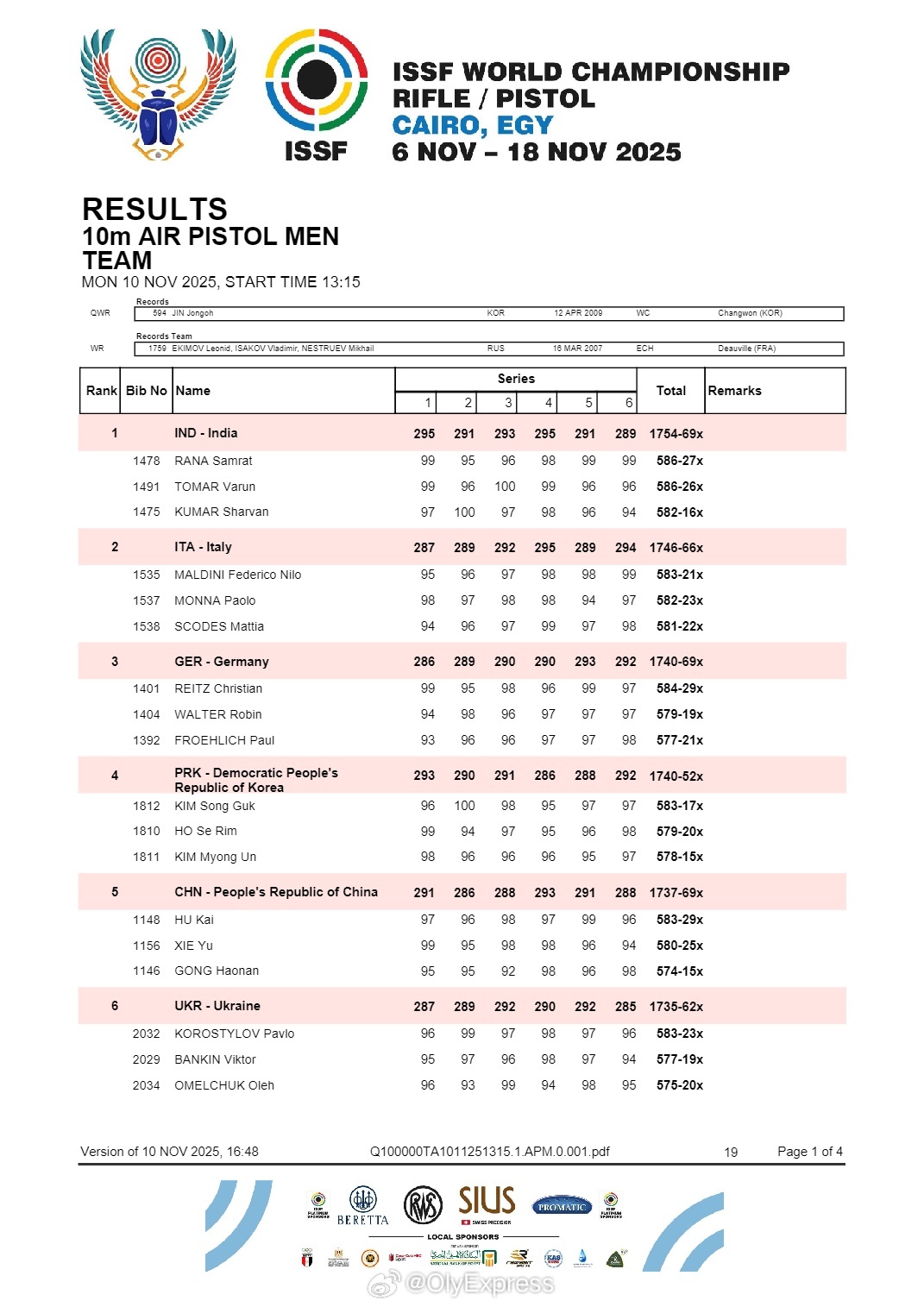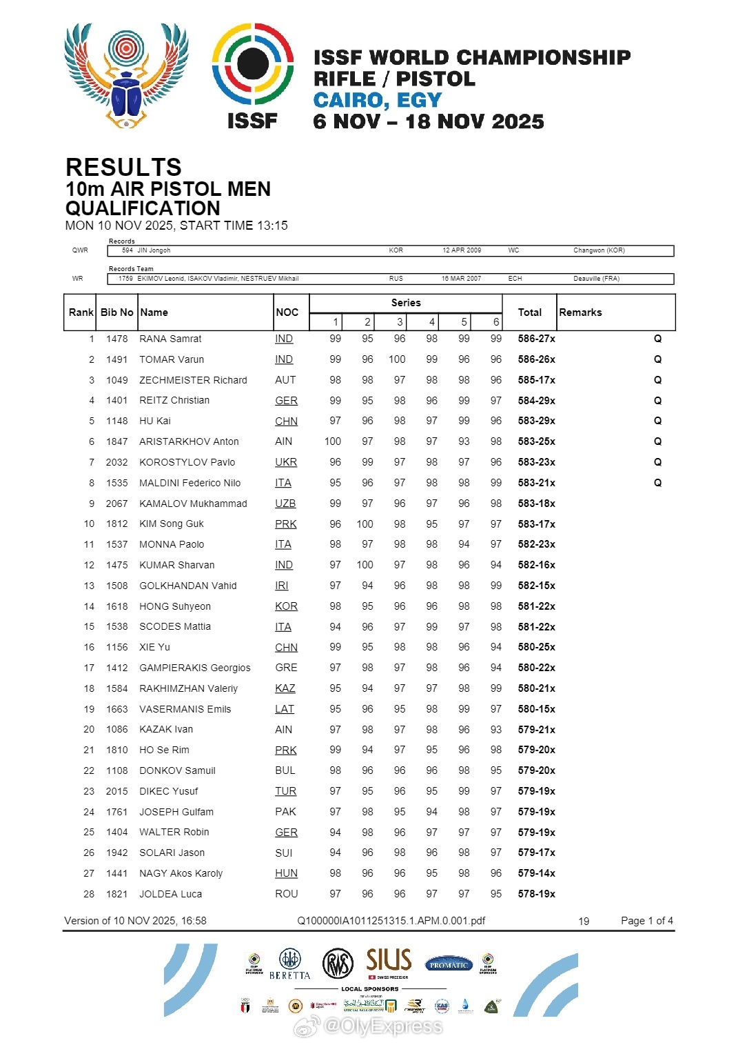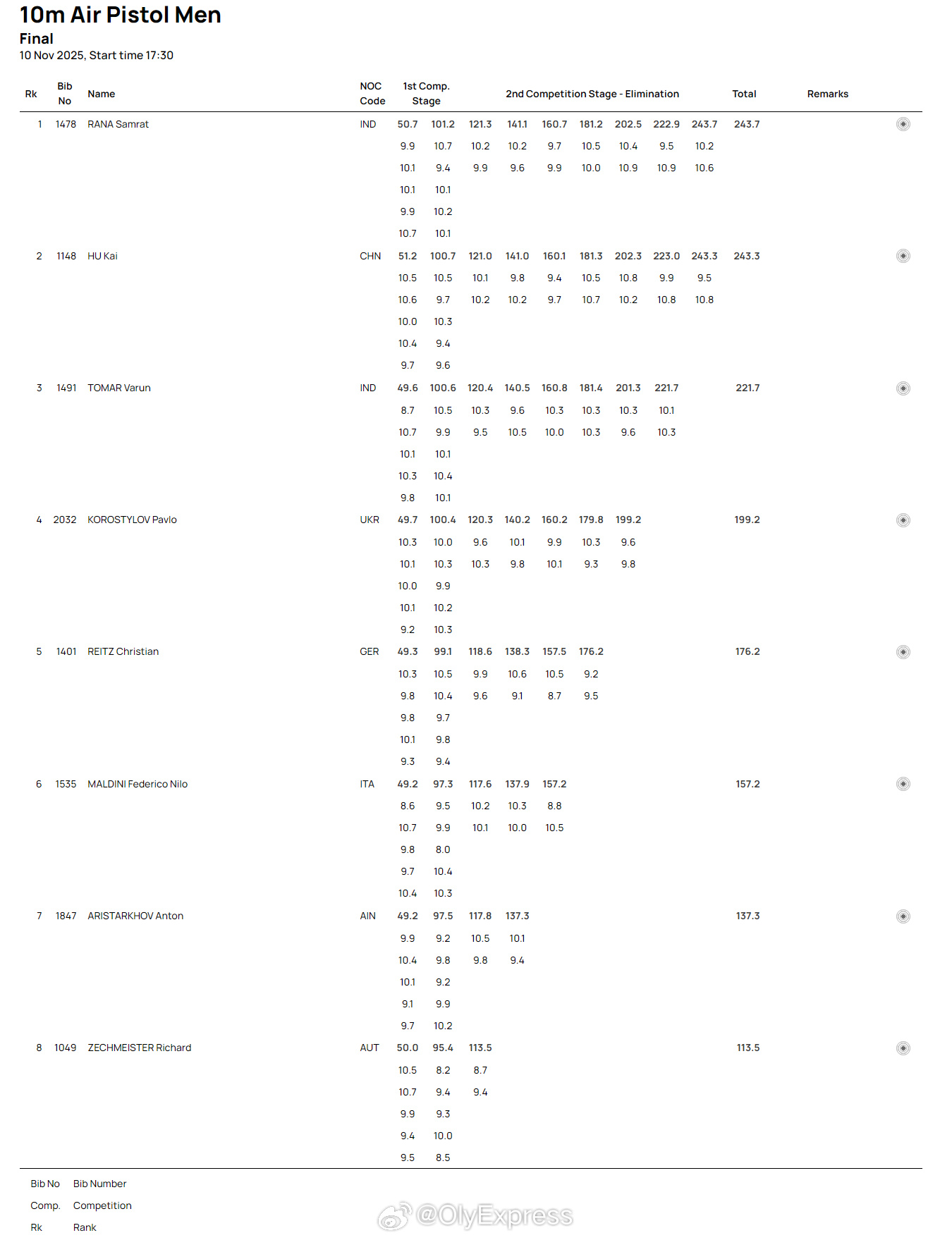 【射击世锦赛男子10米气手枪胡凯摘银】国际体坛战报速递 11月10日埃及开罗,2025年射击(步手枪)世锦赛结束男子10米气手枪比赛。赢了一个赛季的中国选手胡凯尽管在最后一枪打出10.8环,仍以0.4环不敌印度选手拉纳,获得亚军,成绩为243.3环。另外一位印度选手托马尔获得铜牌。印度队还夺得团体冠军,中国队名列第五。