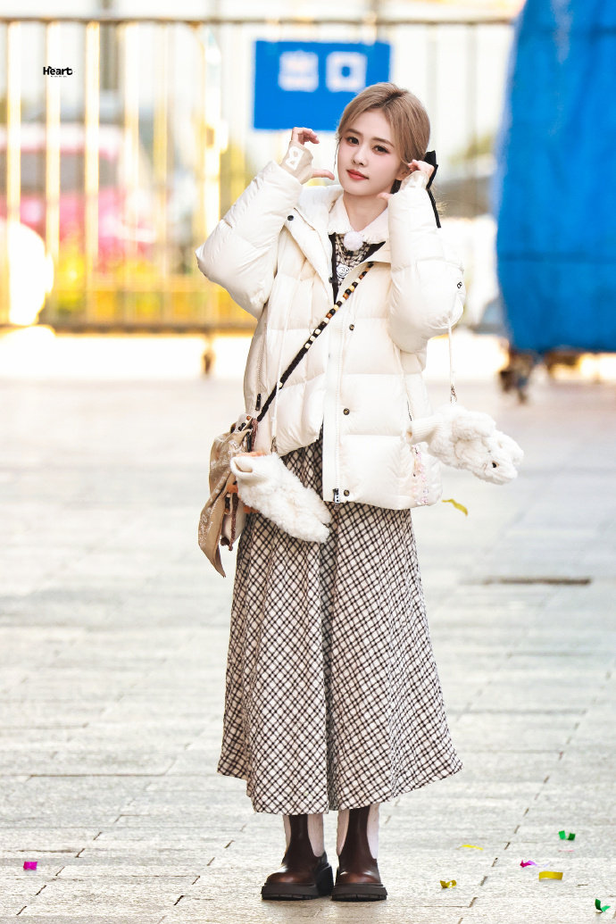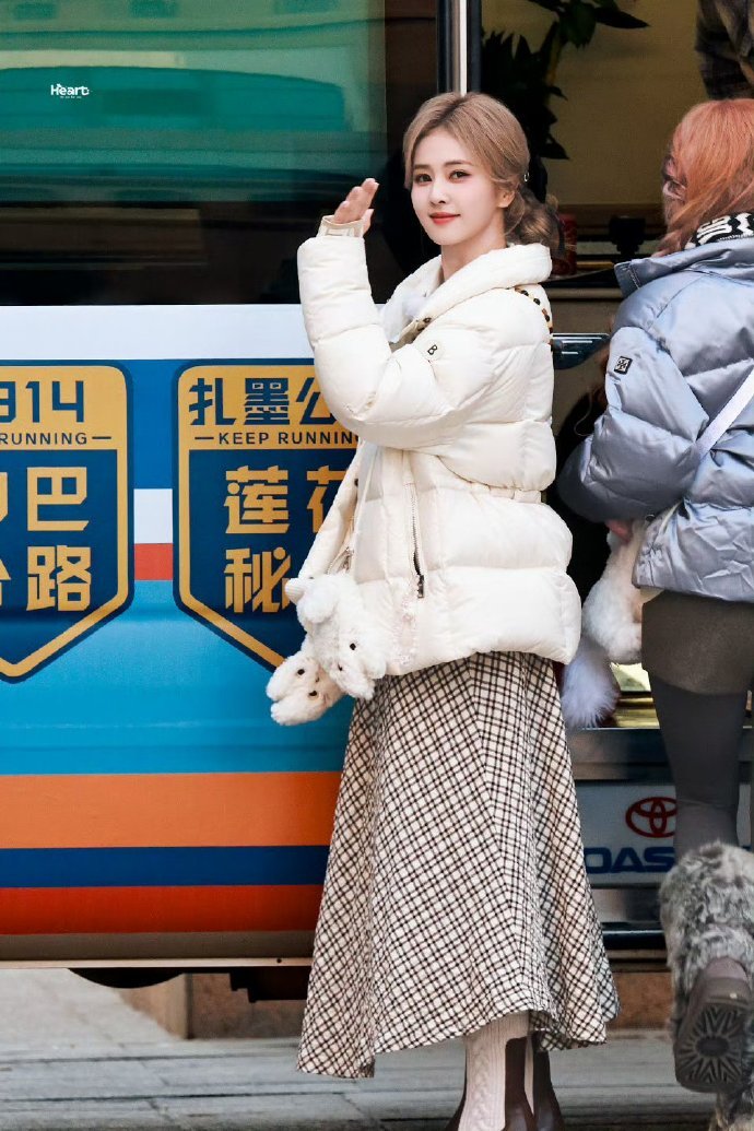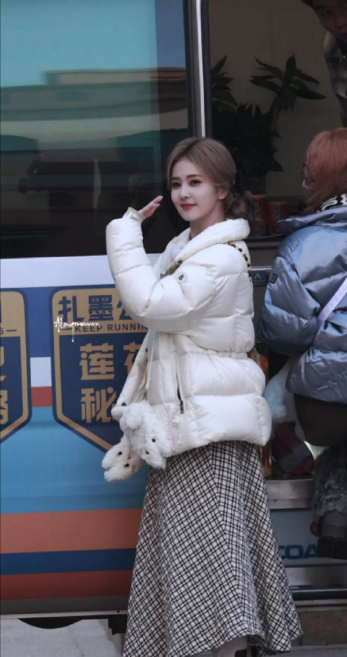 白鹿羽绒服格纹裙look白鹿奔跑吧白色羽绒服格纹裙路透白鹿羽绒服格纹裙loo