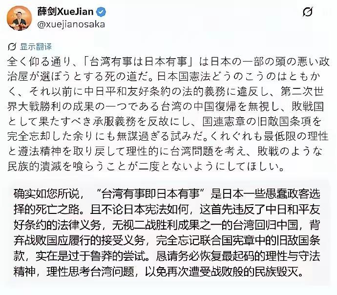 别傻了!还嫌薛剑领事说话不够温和?能说出这种话的人,怕是没搞懂什么叫底线不容触碰!日本首相主动干涉中国内政,公然挑事冲击红线,这时候谈“恰当”“温和”,难道不是变相纵容?对付这种挑衅,就得迎头痛击,客气半分都是对底线的亵渎! 中日历史血海深仇至今未忘,没到兵戎相见的地步,嘴仗上就该寸步不让!日本人气愤才对,要是让他们舒舒服服,那我们的回应才是真没效果——难道还要让挑衅者满意?那些指责领事的人,根本没搞懂:面对公然冒犯,强硬回应不是冲动,是对国家利益的守护,是对历史的敬畏。 软弱换不来尊重,客气换不来收敛,该硬气的时候就得拿出态度!你们觉得,面对他国挑衅,是该强硬反击还是温和忍让?评论区聊聊!