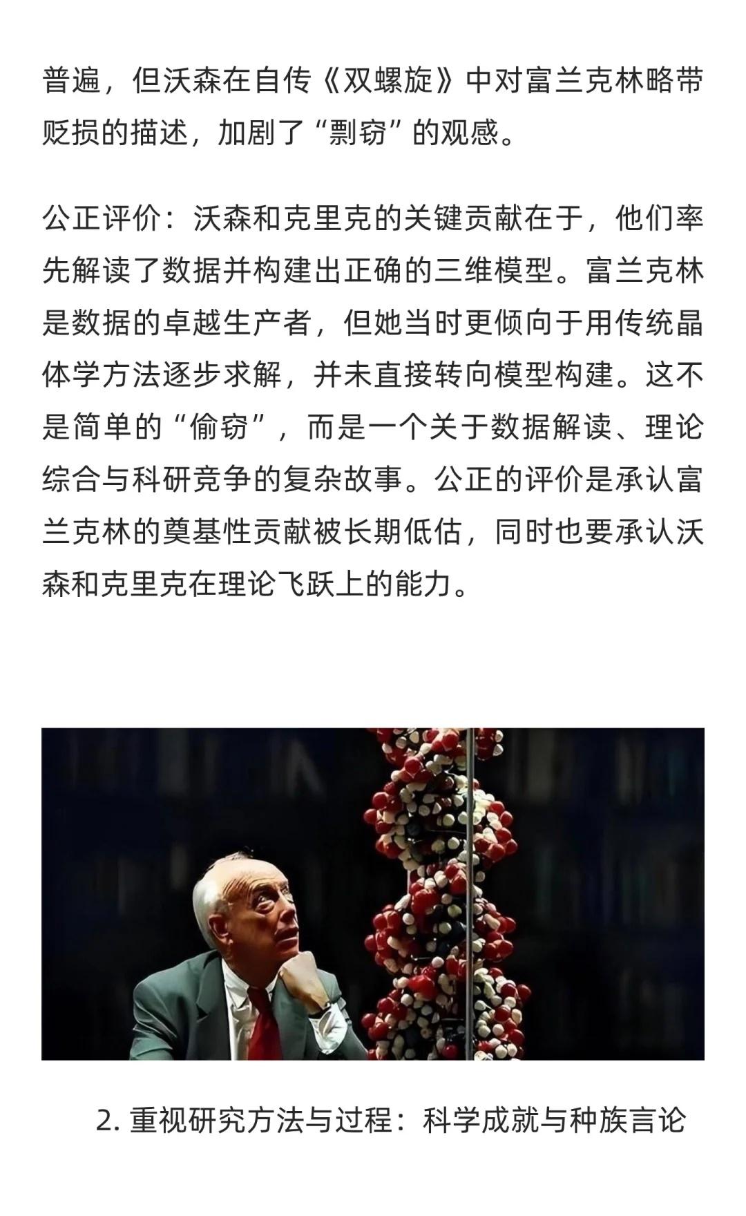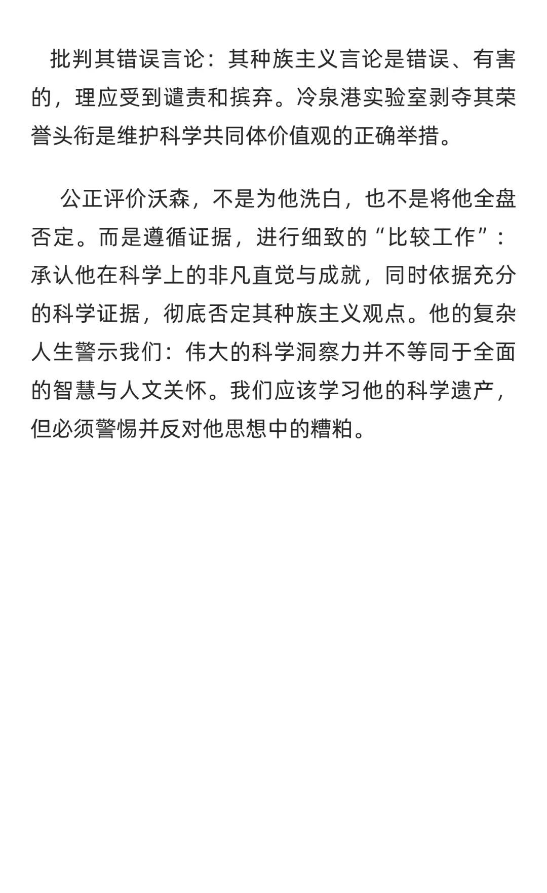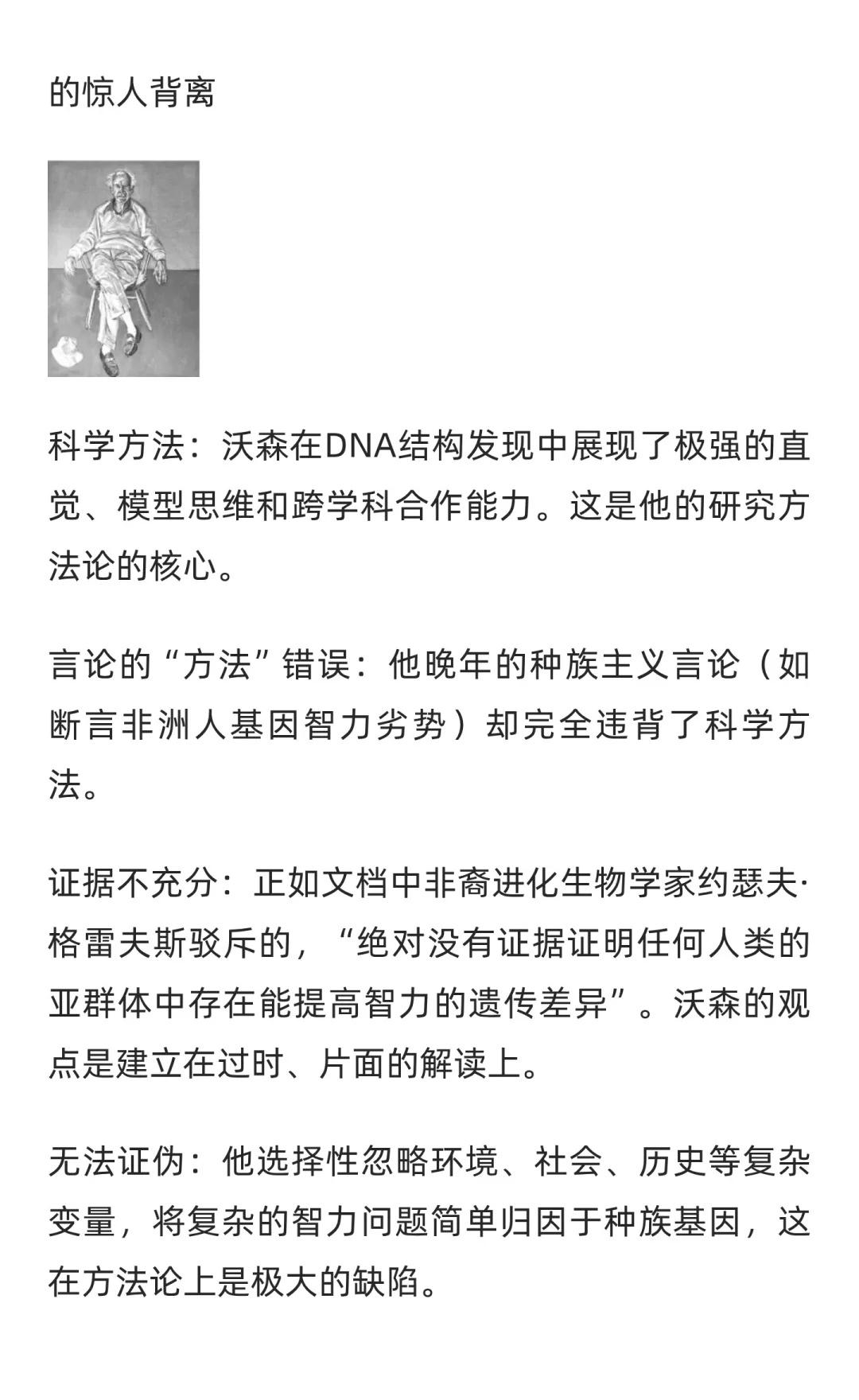 “DNA之父”沃森,科学巨匠还是争议人物? 公正评价沃森,不是为他洗白,也不是将他全盘否定。而是遵循证据,进行细致的“比较工作”:承认他在科学上的非凡直觉与成就,同时依据充分的科学证据,彻底否定其种族主义观点。他的复杂人生警示我们:伟大的科学洞察力并不等同于全面的智慧与人文关怀。 我们应该学习他的科学遗产,但必须警惕并反对他思想中的糟粕。 詹姆斯沃森 DNA 科学伦理 人物评价 罗莎琳德富兰克林 冷泉港实验室 趣味知识科普 薯记观 @科技薯 @薯记观
