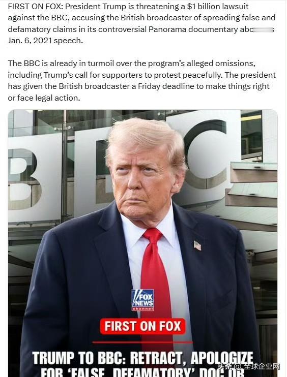 福克斯新闻:特朗普总统威协将对BBC提起10亿美元诉讼,指控该台在其有争议的纪录片中关于他2021年1月6日演讲的内容,散布了虚假和诽谤性言论。 BBC因该节目涉嫌遗漏关键信息(包括特朗普呼吁支持者和平抗议的部分)而陷入混乱。总统已给英国广播公司设定截止日期——必须在周五之前纠正,否则将面临法律诉讼。