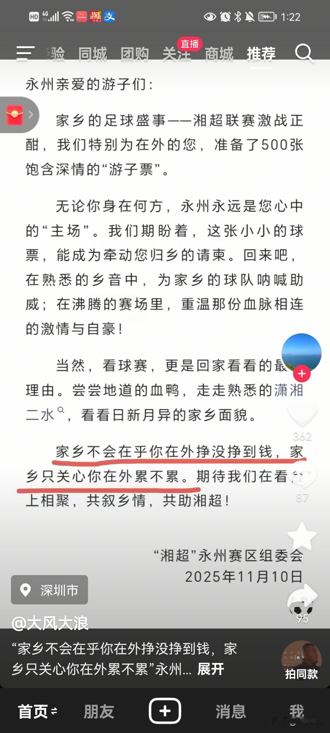 最近看湘超比赛,只要有永州队出场必看,想看又敢看,生怕永州队输球了。老公看我看球赛,问我什么时候这么关注足球了,我说是永州队比赛,自然要看的。 做为湘超话题担当的永州,真的话题不断,官方玩梗玩出新花样了,前有挂票,相亲票,船票,爱心票,这周又出来了一个游子票,让在外打工的100万永州游子回家看球赛,一句家乡不会在乎你在外挣没挣到钱,家乡只关心你在累不累。看得我都想回去看球赛了,回家乡看看了。永州湘超足球 湘超足球球赛 永州足球队 湘超郴州队 永州湘超 湘超永州体育场