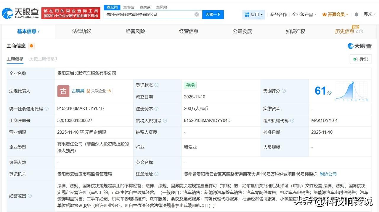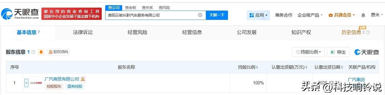 【广汽集团在贵阳成立汽车服务新公司】 天眼查工商信息显示,近日,贵阳云岩长黔汽车服务有限公司成立,法定代表人为古明昊,注册资本200万人民币,经营范围包括新能源汽车整车销售、汽车零配件零售、机动车充电销售等。股东信息显示,该公司由广汽集团(601238)旗下广汽商贸有限公司全资持股。 天眼查信息: