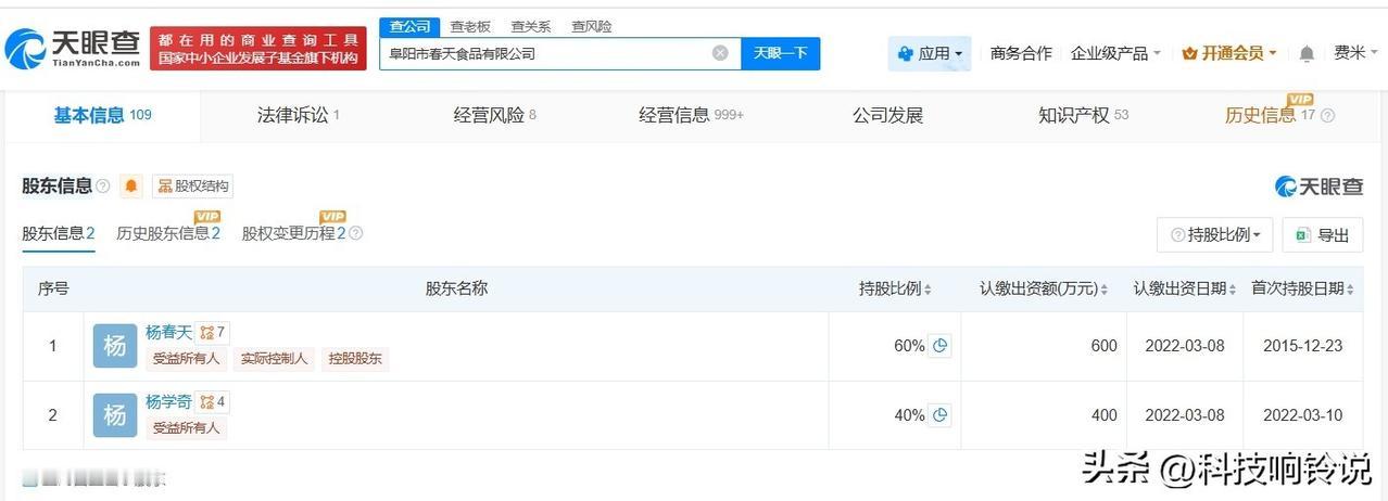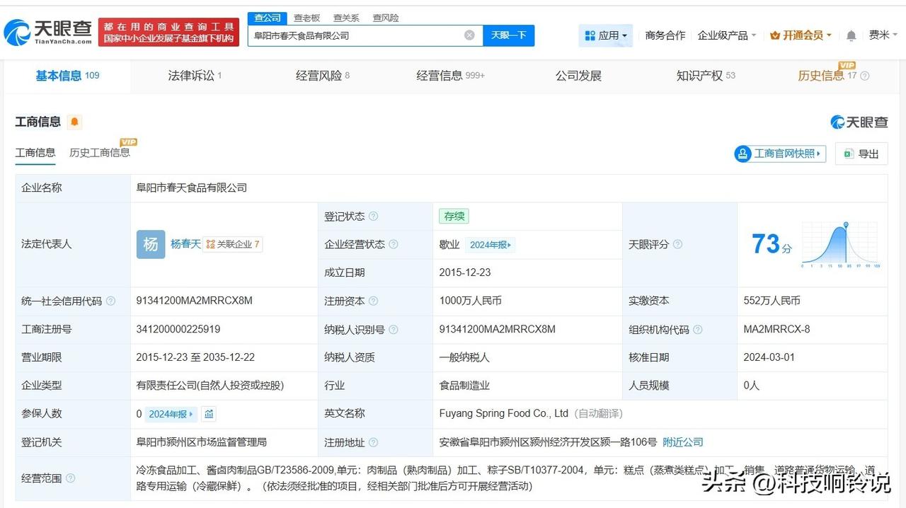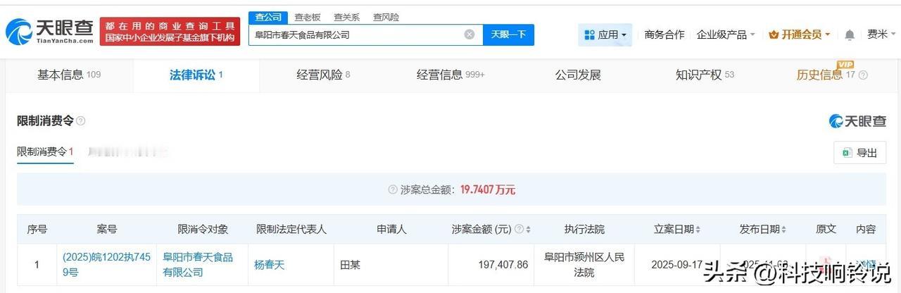 【遭315曝光的槽头肉公司被限消 遭315曝光的槽头肉公司因19万案款被限消】 天眼查天眼风险信息显示,近日,阜阳市春天食品有限公司及其法定代表人杨春天新增一则限制消费令,涉案金额19万余元,执行法院为阜阳市颍州区人民法院。 阜阳市春天食品有限公司成立于2015年12月,注册资本1000万人民币,经营范围包括冷冻食品加工、道路普通货物运输、道路专用运输等。股东信息显示,该公司由杨春天、杨学奇分别持股60%、40%。据媒体报道,在此前的央视“3·15”晚会上,该公司因被曝光使用劣质槽头肉制作梅菜扣肉预制菜,引发舆论关注。 天眼查信息: