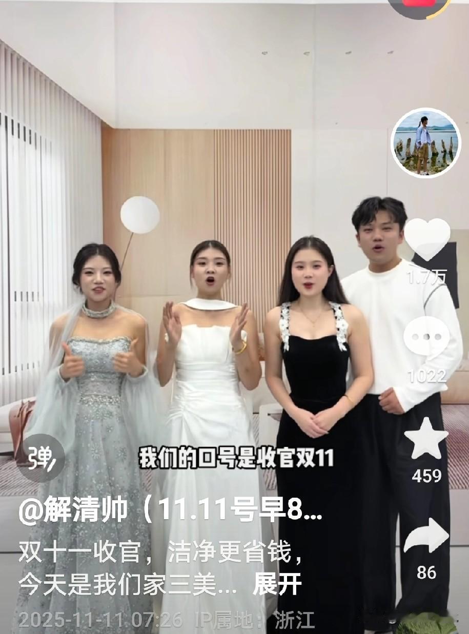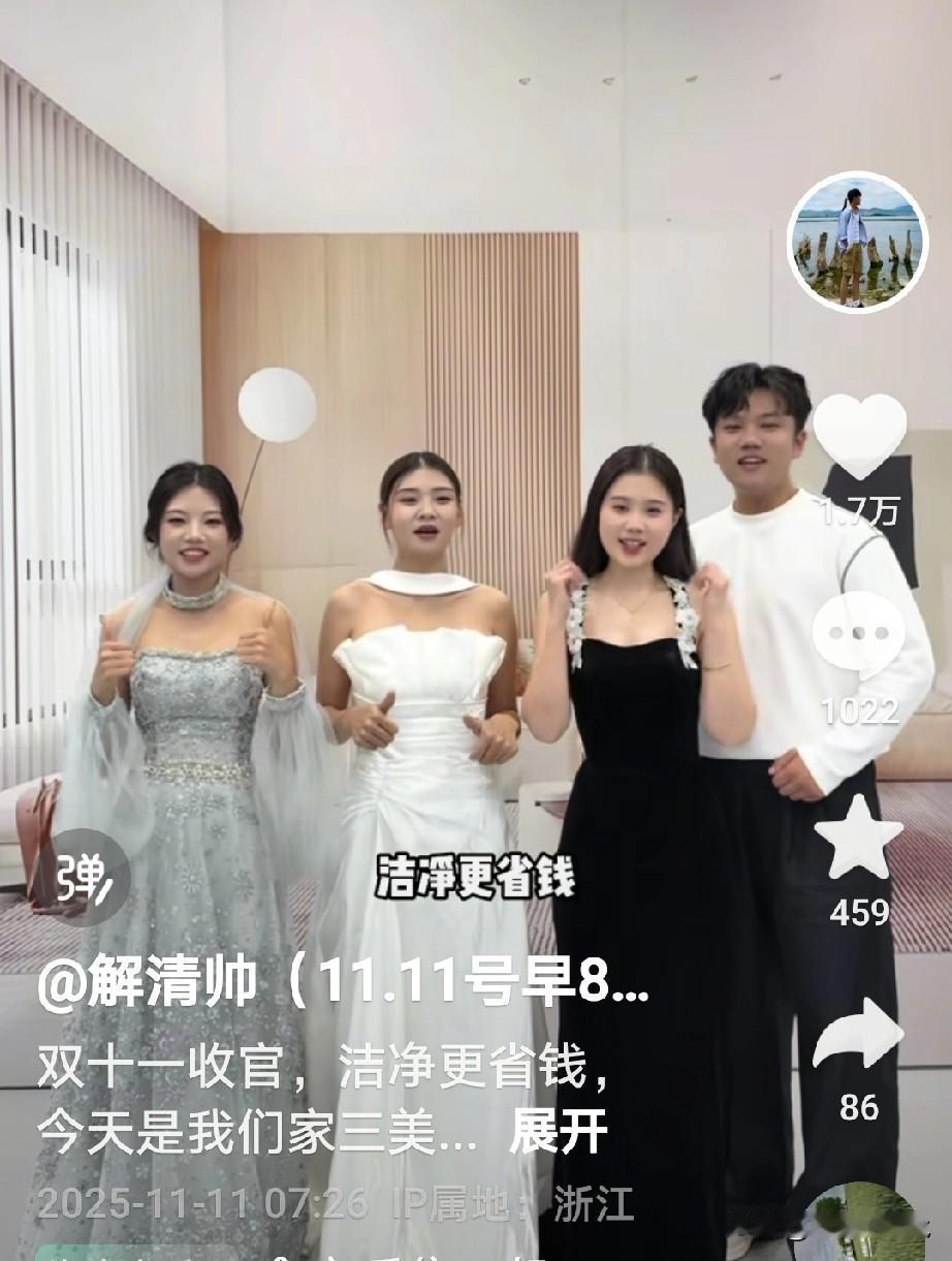 感觉这个视频拍的有点尬[捂脸] 感觉解清帅就是一个多余的, 解清帅在视频里说,今天的主角是解家三美女, 大家也看的出来她们仨今天穿的这么隆重, 穿的也非常露[捂脸] 有网友说:嫂子真是太漂亮了,身材和颜值都特别棒