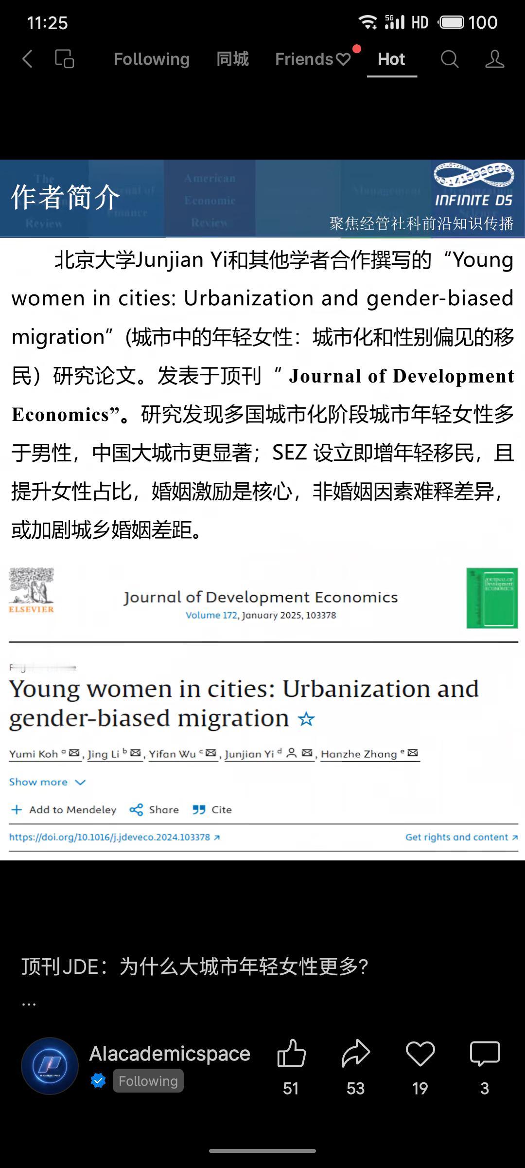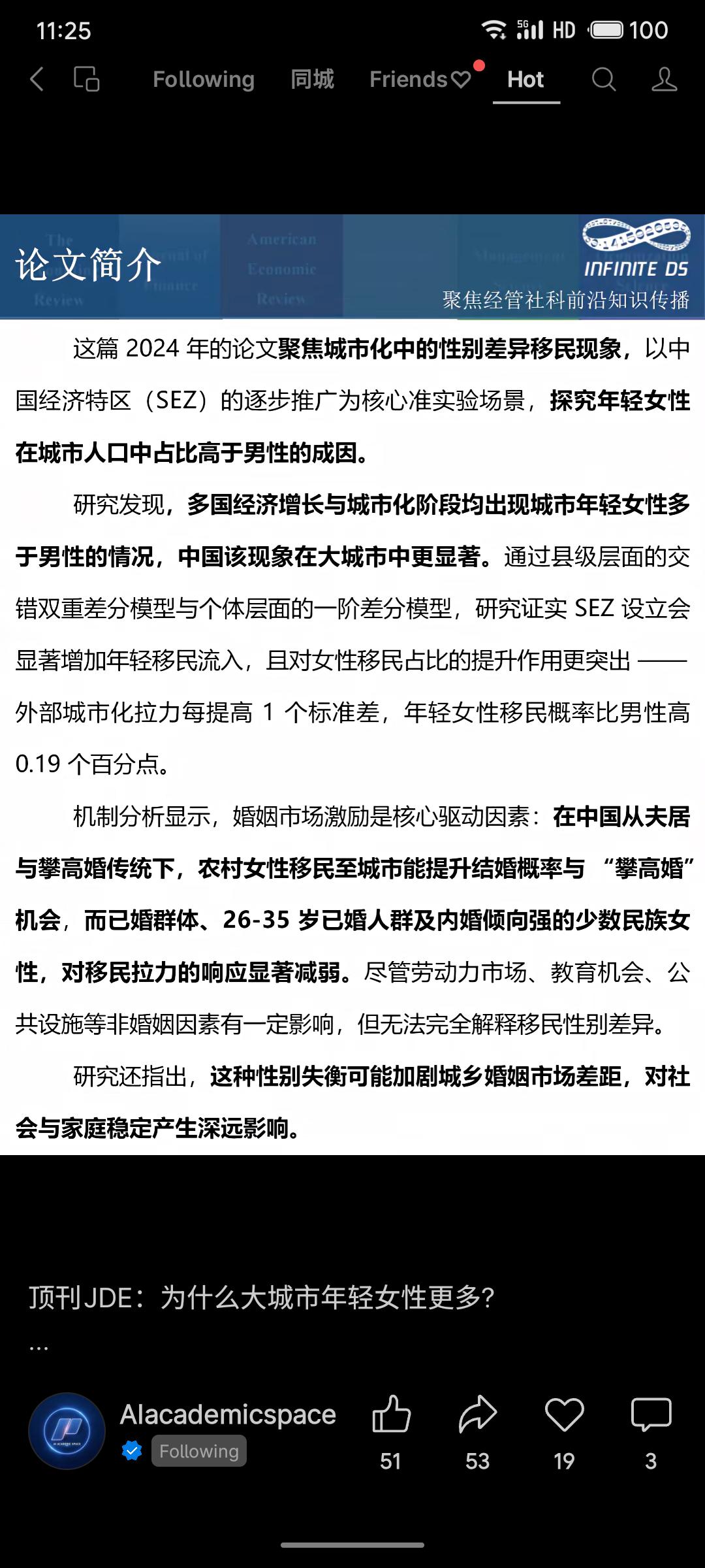 北京大学等在顶刊JDE发表的研究指出,中国城市化进程中大城市年轻女性多于男性。通过分析经济特区政策发现,婚姻激励是主因——农村女性为提升婚恋机会更倾向迁入城市,而教育、就业等因素无法完全解释该现象。 该研究敏锐揭示了城市化中的性别差异,对理解婚姻失衡及社会结构变迁具有重要启示。