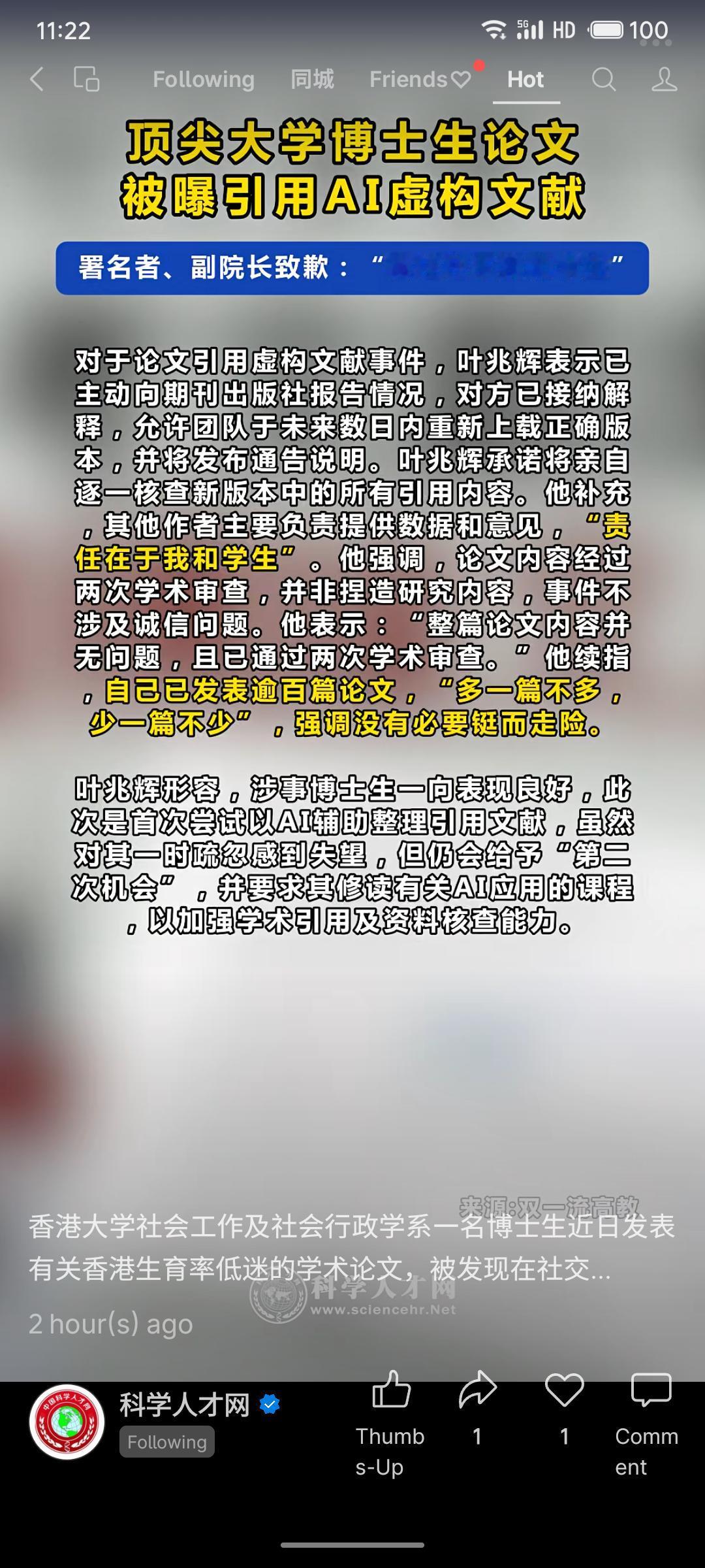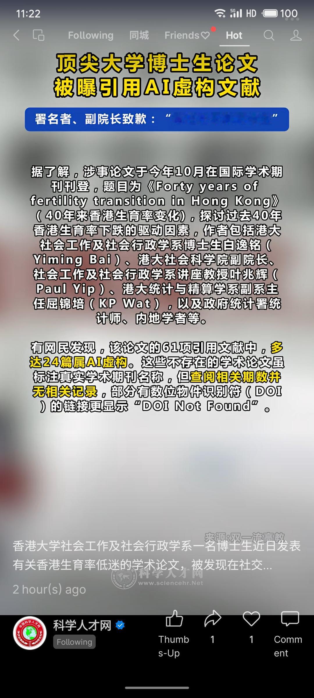 香港大学一博士生在关于香港生育率的学术论文中,被曝出大量引用由人工智能生成的虚构文献。该论文的共同作者包括港大社会科学院副院长叶兆辉,其回应称系学生使用AI整理文献后未加核对所致,并就此致歉,表示将重新提交正确版本。事件引发对学术规范与AI使用的关注。