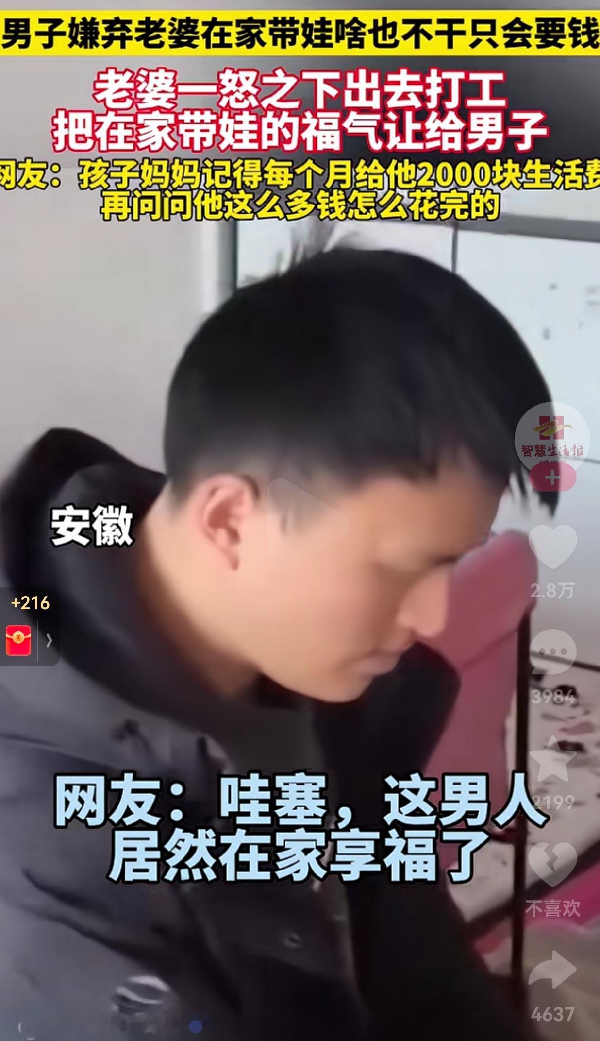 这不是自作自受吗?安徽,一女子在家全职带娃,没有工作,每个月还要伸手问老公要钱花