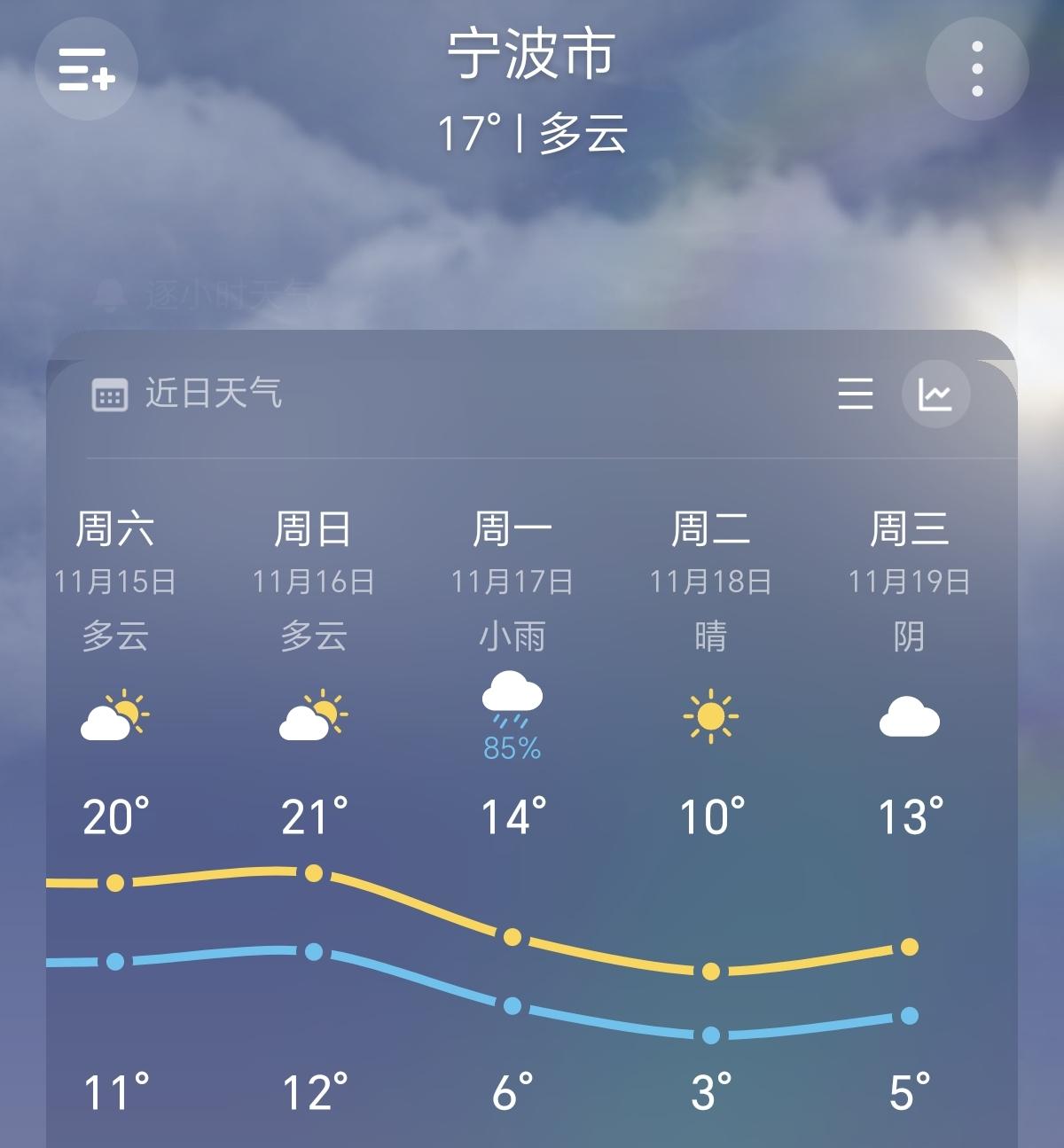 宁波人民羽绒服,棉服,秋裤,可以准备起来了。下周一开始,冷空气将会强势来袭。最低气温会降到3-6℃,最高气温也是在10-14℃左右。这个温度降幅还是有点猛的,气温低于10℃,在体感方面,感觉会比较冷。所以,现在秋裤、羽绒服、棉服、羊绒大衣等等,都可以根据自己的穿搭喜好,准备起来了。过完周末,下周一出门上班、上学、买菜、逛街、游玩等,可别冻感冒了。 来源:天气预报