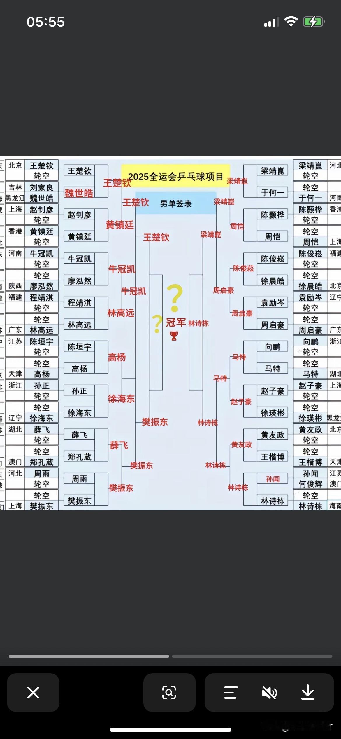 今天有林诗栋的比赛,小石头加油! 昨天向鹏输了、徐瑛彬输了。 全运会乒乓球比赛是世界平均水平最高的赛事,每一场基本就是决赛,谁赢都有可能[捂脸] 所以希望小石头林诗栋要认真对待每一场比赛。千万不能翻车。 今天林诗栋对阵孙闻。孙闻战胜了何俊辉晋级32强。也不是太弱。但是所有人都认为林诗栋晋级16强。 我觉得也是小石头林诗栋晋级16强。 但是林诗栋一定要认真对待。每一场球都和决赛一样。 省队队员。退役老队员都很棒。不可小觑。 加油林诗栋! 期待林诗栋晋级四强! 预测四强 王楚钦对阵樊振东 梁靖崑对阵林诗栋 你们觉得这四强有多大概率?
