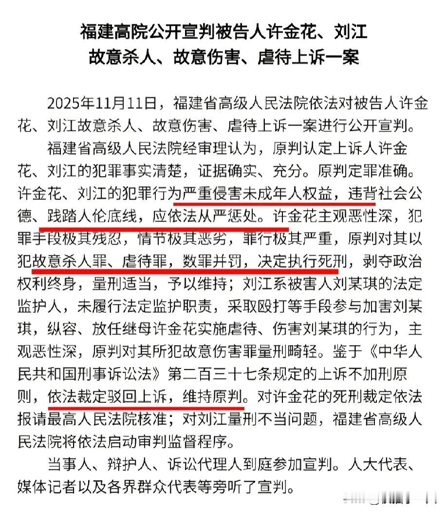 许金花被判死刑,刘江躲过重判,司法系统却没放过他 福建高院昨天作出判决,维持了对许金花的死刑裁定,她杀害并长期虐待自己的继女刘某琪,导致孩子最终死亡,这个案子早就该有个结果了,而更令人难以理解的是她的丈夫刘江,明明是他自己的亲生女儿,他不但没有保护她,还动手打她,甚至帮着许金花一起控制这个孩子,不让她跟外人接触。 根据法律规定,二审判决不能加重刑罚,这被称为"上诉不加刑"原则,所以刘江原本的判决较轻,法院无法直接修改,但这并不是最终结果,高级法院已表示将启动审判监督程序,意味着案件尚未完结,后续会继续审查,可能重新作出判决,这表明法院也意识到仅靠程序难以解决问题,需要采取实际措施。 刘江并非所谓不懂事的父亲,而是主动参与暴力行为的人,孩子在学校受伤时老师没有反应,邻居看到孩子被打也没有举报,这不是一个人的问题,而是整个监护体系失效了,法律规定父母应该保护孩子,却没有人监督他们是否做到,学校、社区和医院这些地方本该最先发现问题,结果都没有采取行动。 很多人都在问孩子最后一次看病是谁接诊的,有没有老师或者社工注意到她身上带着伤,这些细节以后会成为监督流程里的重点,大家关注这些事,是希望以后能避免类似的悲剧再次发生,许金花用的手段有多狠,官方没有详细说明,但极其残忍这四个字已经足够说明情况,这不是突然爆发的行为,而是长期积累下来的暴力表现。 最高法上个月发布新规定,监护人故意不履行职责导致严重后果的必须从重处罚,这个案子判决不到一周就与新规对应上了,看起来像是巧合,其实是法律制度在逐步跟上现实情况,我们普通人虽然看不懂复杂的法律条文,但看到法院没有放过那个失职的父亲,心里多少感到一些安慰。