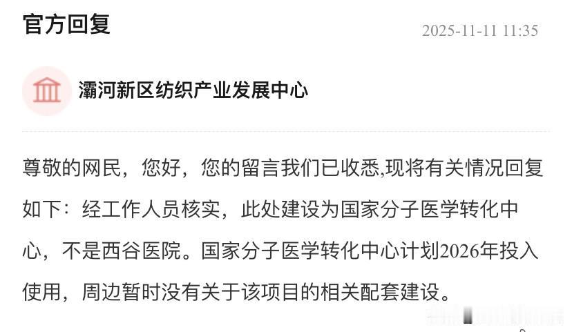 咨询纺织产业园内西谷医院建设情况 纺织产业园内计划建设的西谷医院被搁浅了很长一段时间没有开建。今年以来发现规划地开始动工了,咨询一下现在的原西谷医院规划地建设的是否属于西谷医院?预计什么时候完工?此外有没有其他配套建设? 盼复,谢谢! 官方回复 2025-11-11 11:35 灞河新区纺织产业发展中心 尊敬的网民,您好,您的留言我们已收悉,现将有关情况回复如下:经工作人员核实,此处建设为国家分子医学转化中心,不是西谷医院。国家分子医学转化中心计划2026年投入使用,周边暂时没有关于该项目的相关配套建设。