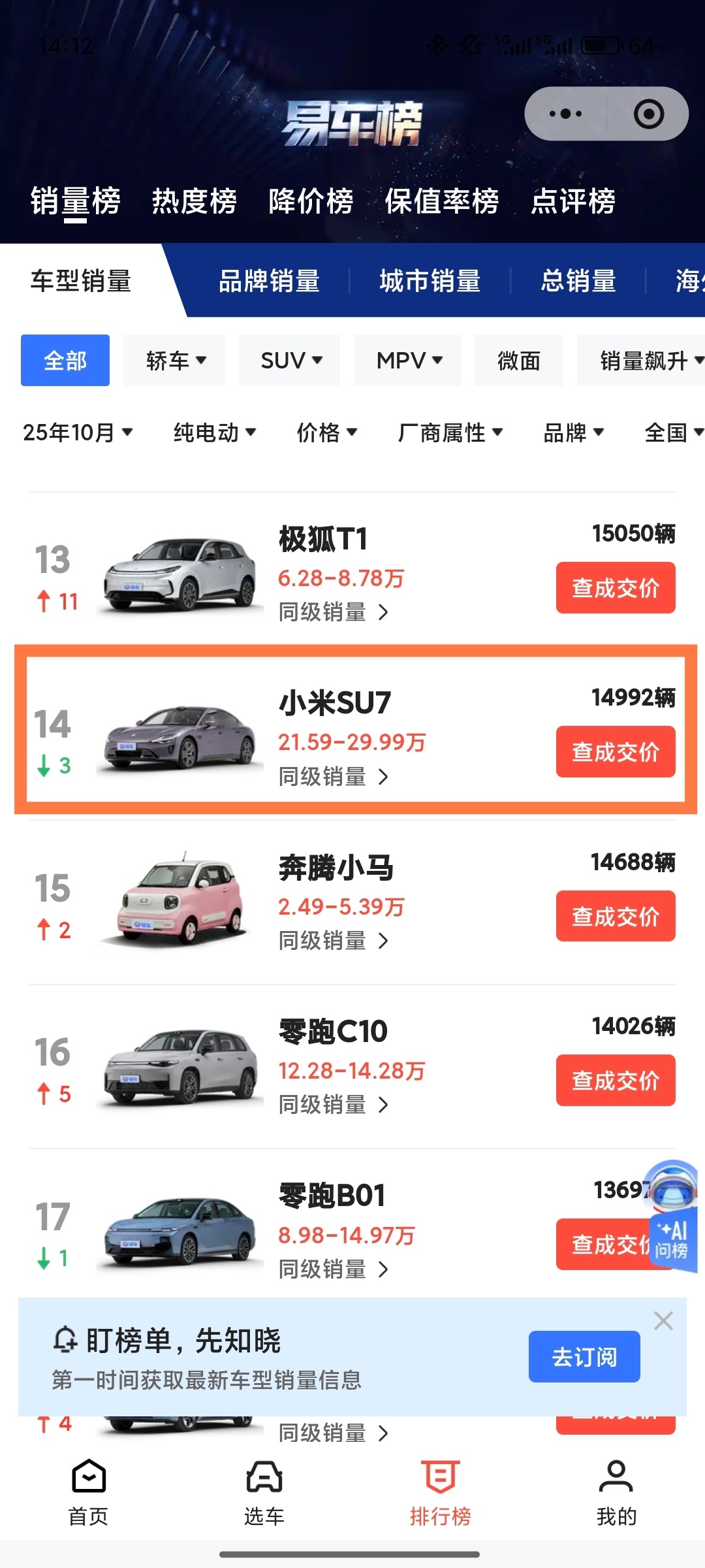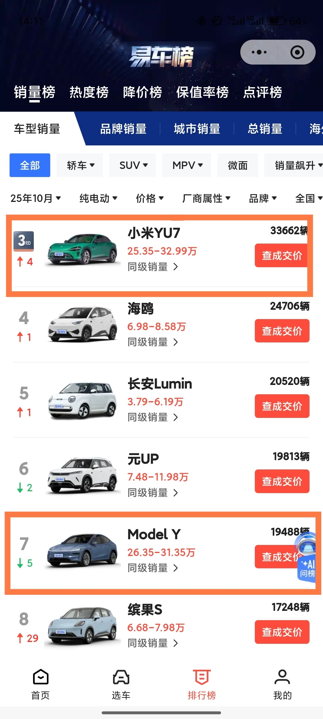 没营养的谣言,不如关注汽车本身。20万以上的纯电动,10月份销量来看,就是小米YU7、特斯拉ModelY和小米SU7位列三甲。从整体销量来看,小米YU7已经远超特斯拉ModelY,不过可能因为给小米YU7生产让路,小米SU7实际销量下滑,但是依然大幅领先特斯拉Model3。关注汽车本身,信息以官方为准。
