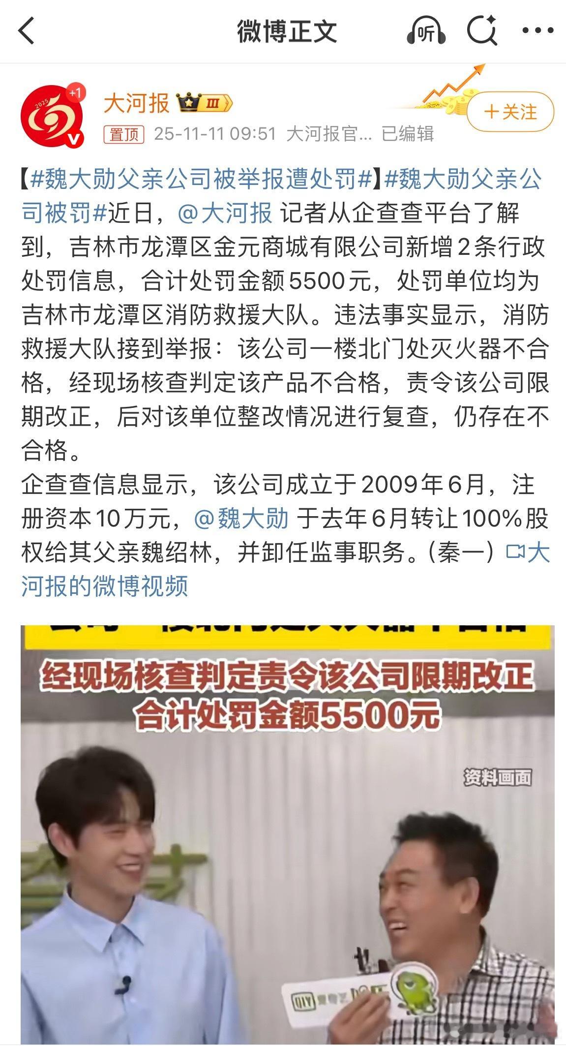 魏大勋父亲公司被举报遭处罚 消防安全不容小觑,有问题及时整改,不管是不是被举报,都是对自己和他人的负责。🧯