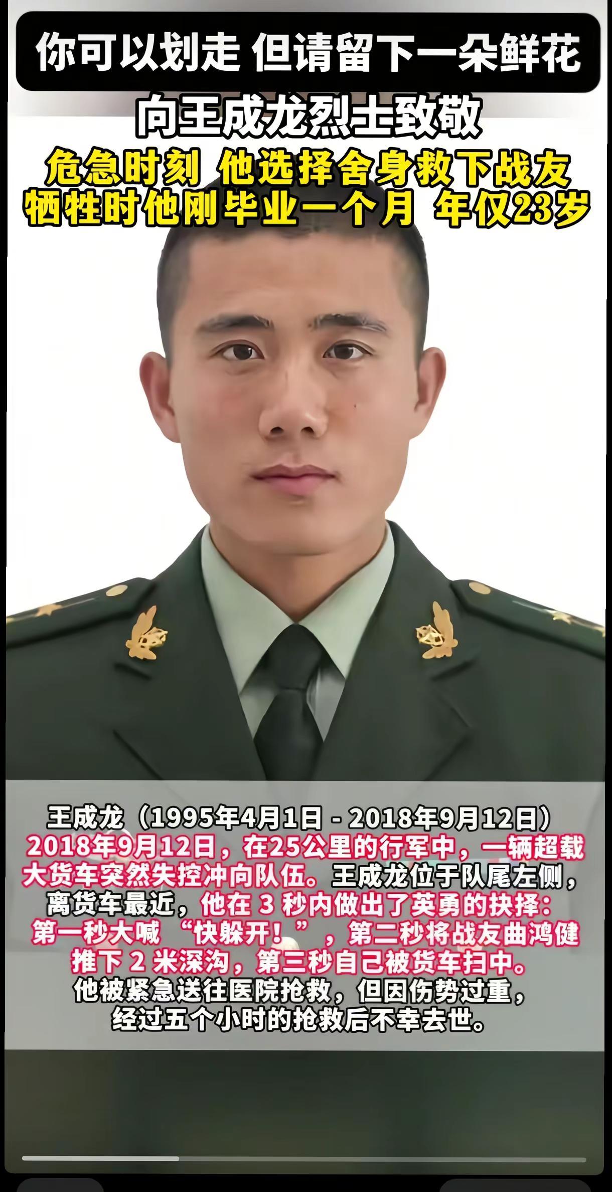 你可以划走,但求留下一朵鲜花,向王成龙烈士致敬!危机时刻,他选择舍身救下战友,牺牲时他刚毕业一个月,年仅23岁,