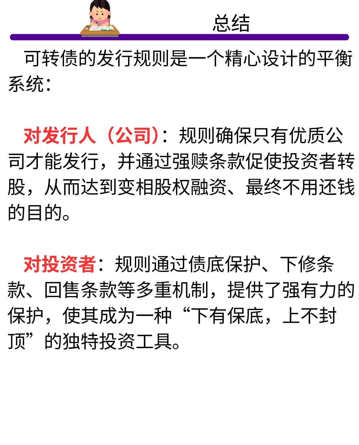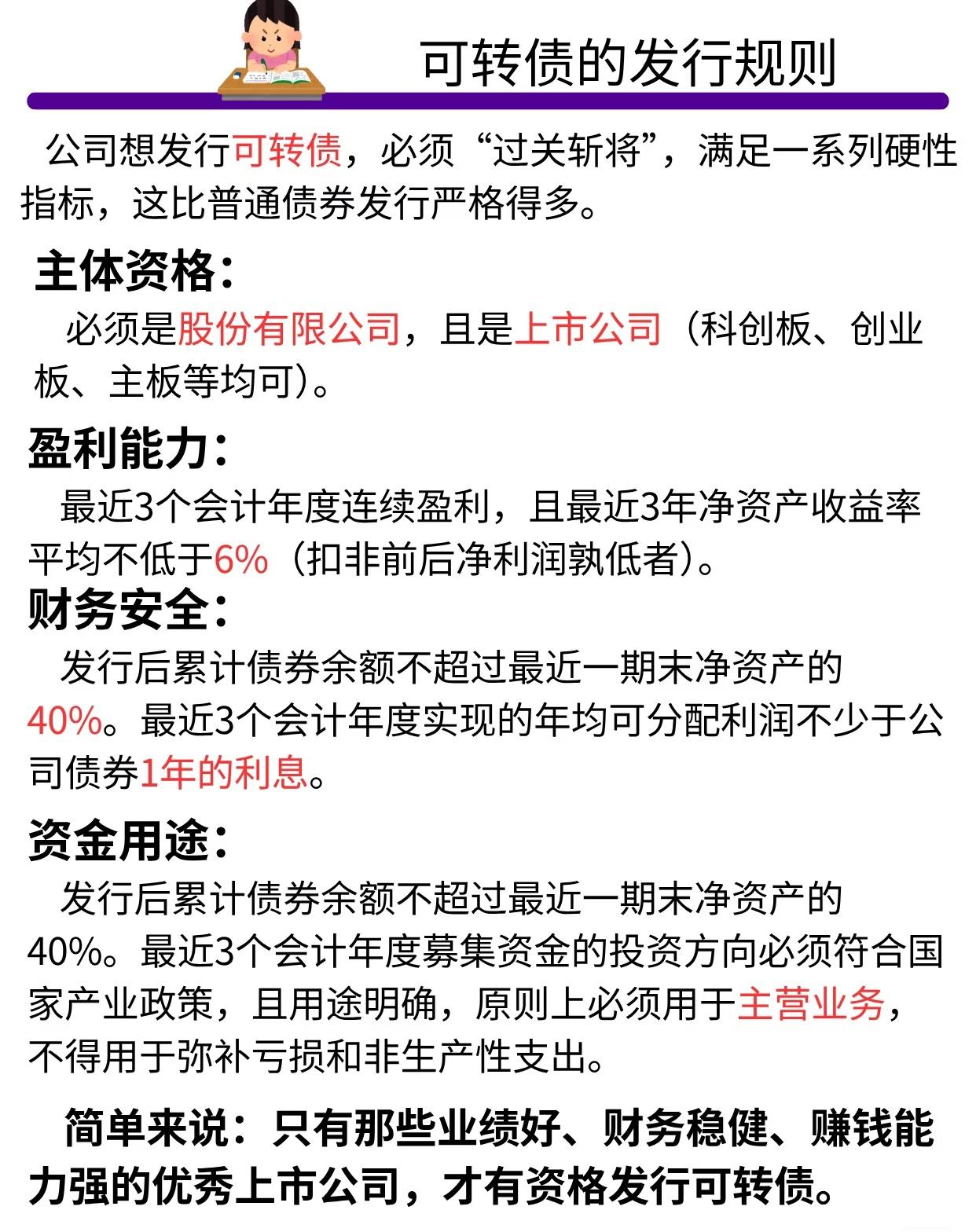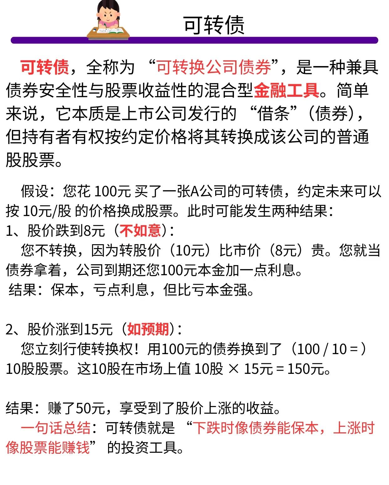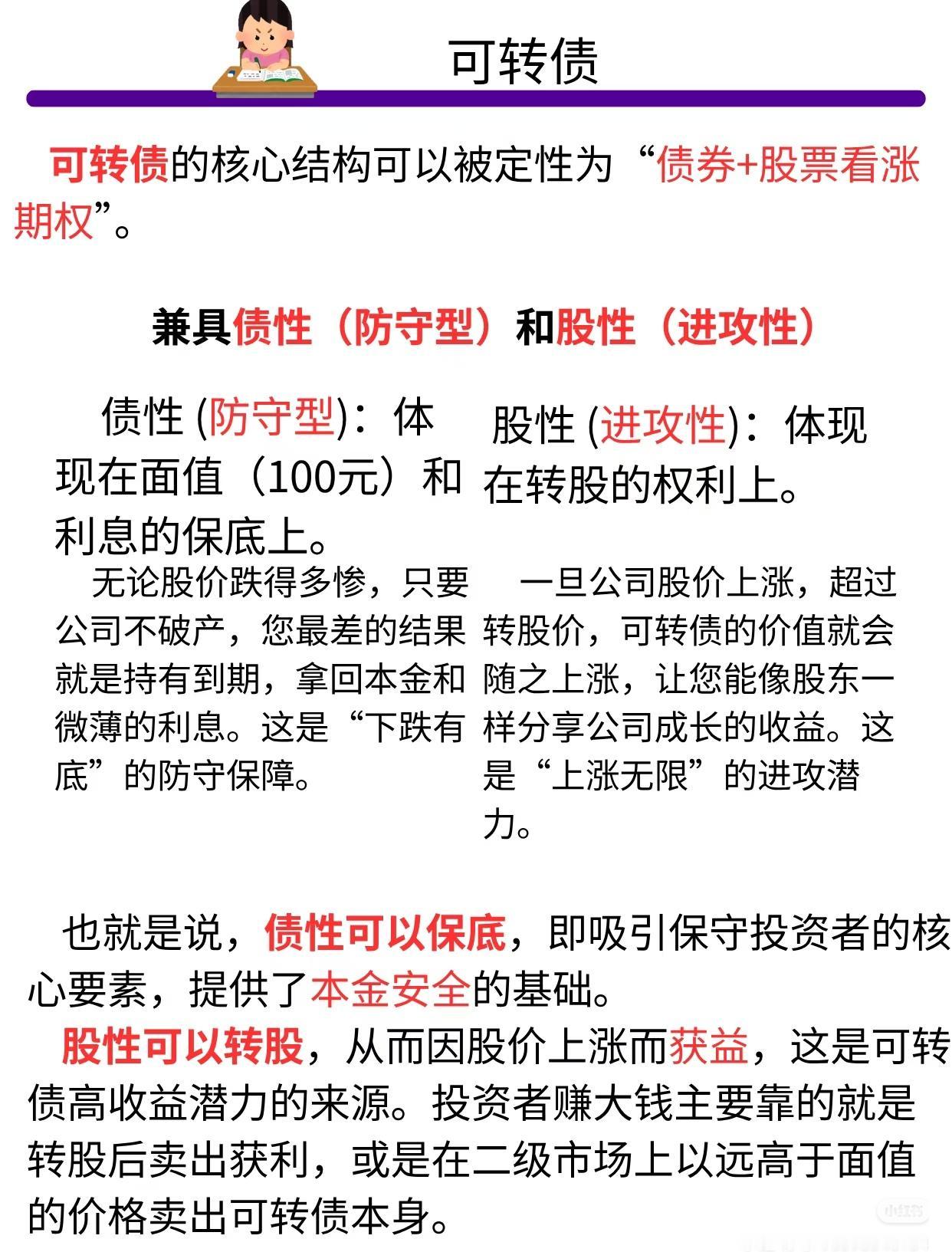 为你整理了一份完整、清晰、易于理解的可转债知识科普总结,涵盖基本概念、核心特点、结构组成、发行规则及对发行方与投资方的意义,方便你系统学习这一金融工具: 一、什么是可转债? 全称:可转换公司债券 可转债本质上是由上市公司发行的一种特殊债券,但它与普通债券不同之处在于: 👉 它不仅具备债券的“保本+收息”属性,还赋予持有者在一定条件下将债券转换为公司股票的权利。 简单说,它就是一张“借条”,但你多了一个选择权: - 如果公司发展好、股价上涨,你可以把债券转换成股票,享受股价上涨带来的收益(像股票一样赚钱); - 如果公司表现不佳、股价下跌,你可以选择不转股,继续持有债券,到期收回本金和少量利息(像债券一样保本)。 🔑 核心特点总结: “下跌时像债券能保本,上涨时像股票能赚钱” 二、可转债的核心结构:债券 + 股票看涨期权 可转债可以拆解为两个金融工具的组合: 1. 债券属性(债性 / 防守型) - 持有到期可收回面值(通常为100元)和约定的利息,有本金保障。 - 即使股价一直跌,只要公司没破产,你至少不会亏掉本金,只是少赚点利息。 - ➤ 提供“下跌有底”的保护,吸引风险偏好较低的保守型投资者。 2. 股票看涨期权属性(股性 / 进攻型) - 可转债赋予你在特定价格(称为“转股价”)下,将债券转换为公司股票的权利。 - 如果公司股价上涨超过转股价,你可以转股后卖出获利,或者直接在市场上以更高价格卖出可转债。 - ➤ 具备“上涨无限”的潜力,是可转债高收益的来源。 🎯 总结: 可转债既保底又可能高收益,是“进可攻、退可守”的独特投资品种。 三、举个例子帮你理解可转债的运作机制 假设你花100元买入了A公司发行的可转债,转股价是10元/股,也就是说,每100元债券可以换成10股股票(100 ÷ 10 = 10股)。 接下来有两种可能: 情况一:股价表现不如预期(比如跌到8元) - 此时转股不划算,因为转股价(10元)高于市场价(8元)。 - 你选择不转股,继续持有债券,到期后公司会还你100元本金 + 少量利息。 - ✅ 结果:保住了本金,只损失了一点利息,比直接亏本金强。 情况二:股价表现超出预期(比如涨到15元) - 你选择行使转股权,用100元债券换成10股股票。 - 这10股在市场上值 10 × 15元 = 150元。 - ✅ 结果:你赚了50元,享受了股价上涨带来的收益! 📌 总结一句话: 可转债就是一种“下跌时有债券保底,上涨时能变成股票赚钱”的灵活投资工具。 四、可转债的发行规则:不是所有公司都能发 可转债并不是随便哪家公司就能发行的,它的发行门槛实际上比普通债券要高很多,监管也更为严格。目的是保护投资者,确保只有真正优质的上市公司才能发行可转债。 发行可转债的公司必须满足以下条件: 1. 主体资格 - 必须是股份有限公司,而且是上市公司(包括主板、科创板、创业板等)。 2. 盈利能力 - 最近3个会计年度要连续盈利,且净资产收益率(ROE)平均不低于6%(扣非前后净利润取低值)。 3. 财务安全 - 发行后,公司累计债券余额不能超过最近一期净资产的40%; - 最近3年每年的平均可分配利润,要足够支付债券一年的利息。 4. 资金用途 - 募集到的资金必须用于符合国家产业政策的主营业务,不能用来弥补亏损或做非生产性支出。 🔒 总结一句话: 只有那些业绩优良、财务健康、盈利能力强的优质上市公司,才够格发行可转债。 五、可转债发行规则的意义:一套平衡双方利益的机制 可转债的整个发行与运作体系,其实是一套精心设计的“平衡系统”,兼顾了发行公司(融资方)和投资者双方的利益: 对发行人(上市公司)而言: - 规则确保了只有优质公司才能发行可转债,提升了市场信任度; - 通过设定强制赎回条款(强赎条款),公司可以在股价上涨时促使投资者主动转股,从而把债务转化为股权,不用再还本金和利息,实现变相的股权融资。 对投资者而言: - 规则通过债券的本金与利息保底(债底保护)、转股价下修条款、回售条款等多重保护机制,让投资者即使在市场不利情况下也能减少损失; - 同时保留了股价上涨时获得高收益的可能性; - ➤ 使得可转债成为一种“下有保底,上不封顶”的独特投资工具。