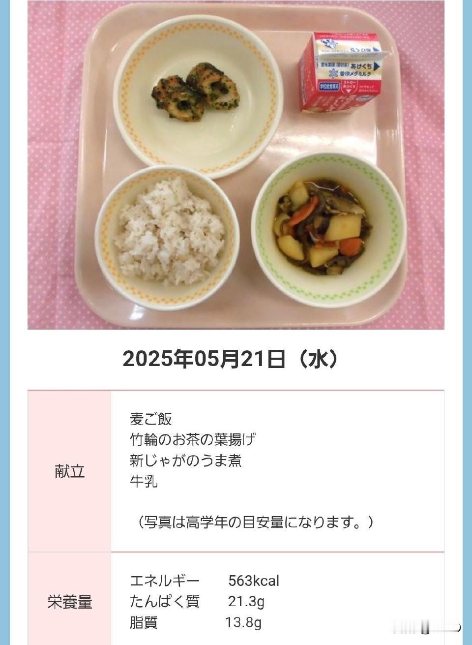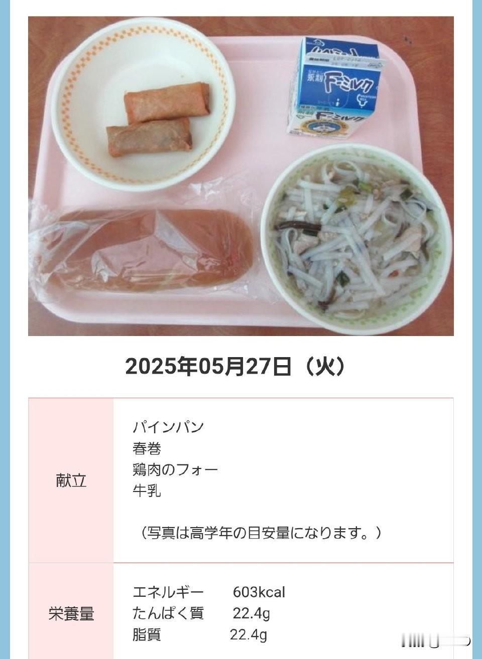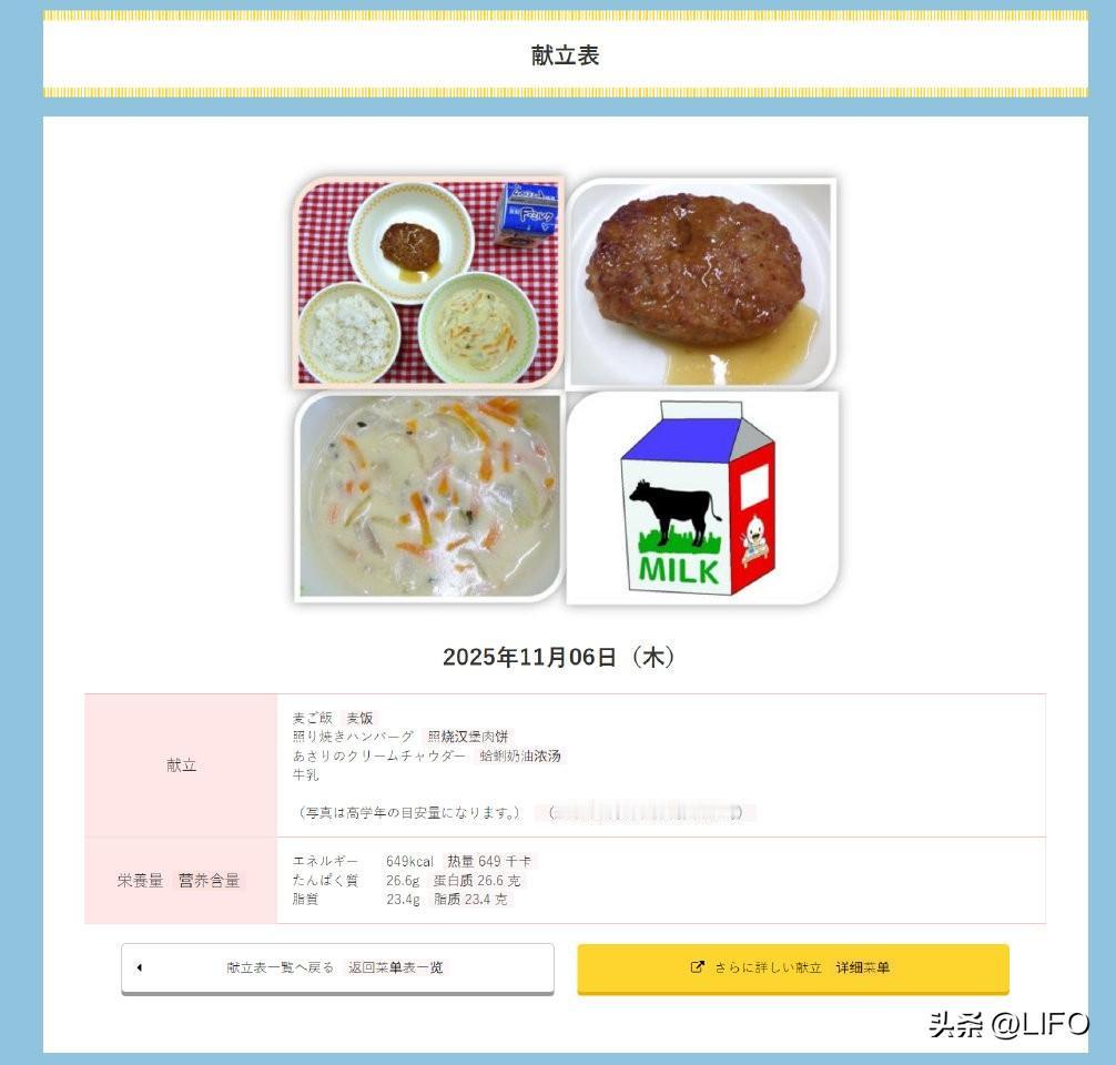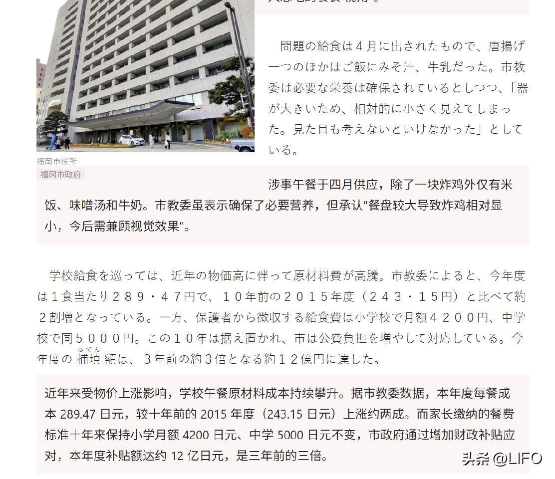 给大家看看日本的学校吃什么。图1是福冈市内某小学,福冈市每名学生单餐预算为 289 日元,今年4月,福冈市这些小学一份仅有一块炸鸡块的午餐就被日本网民吐槽“太少了”“太寒酸”。但相关负责人回应称,这就是传统日式校餐。该学校声称,这一餐福包括一碗麦饭(加了大麦或黑麦的米饭)、一块炸鸡、一碗卷心菜味噌汤和一盒牛奶,“该餐总摄入热量达620千卡,已满足该市每餐600千卡的标准。”?图2-图5是该校今年5月的一些校园午餐,分量越发荒唐了。后续报道是什么呢?因一个炸鸡块午餐引发争议的福冈市教育委员会表示:“由于餐盘过大导致炸鸡块显得相对较小。我们深刻反省应该同时考虑视觉效果。”所以,今后将通过‘缩小餐盘尺寸使炸鸡块显大’的创新方案彻底解决问题吗?是真的,图6是新闻。时隔几个月之后,让我们打开福冈市任意小学的午餐菜单(图6-12),有改善吗?我没有看到。打开福冈任意中学的午餐菜单(图13-18),比福冈的小学更好吗?我也看不出来。