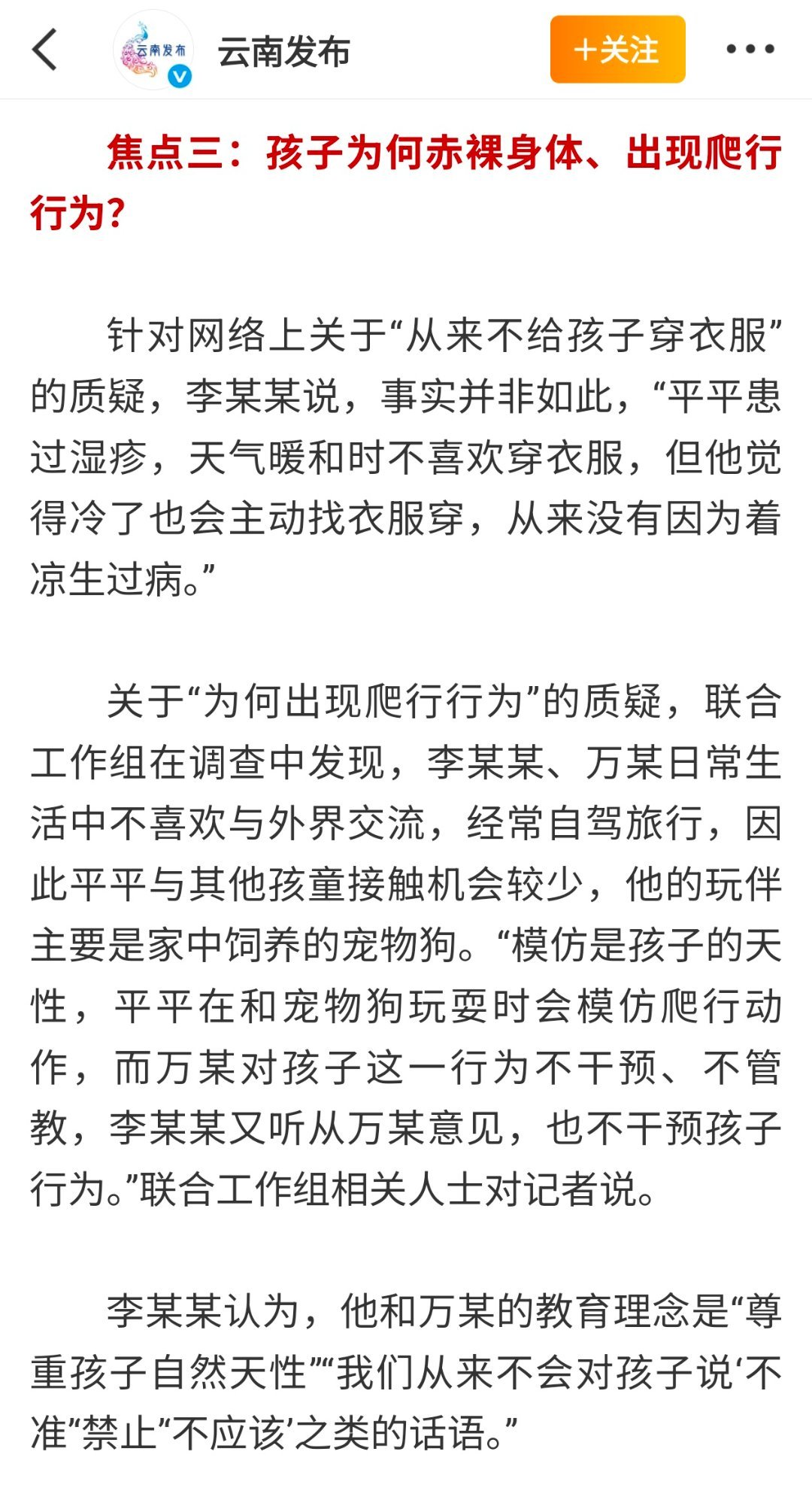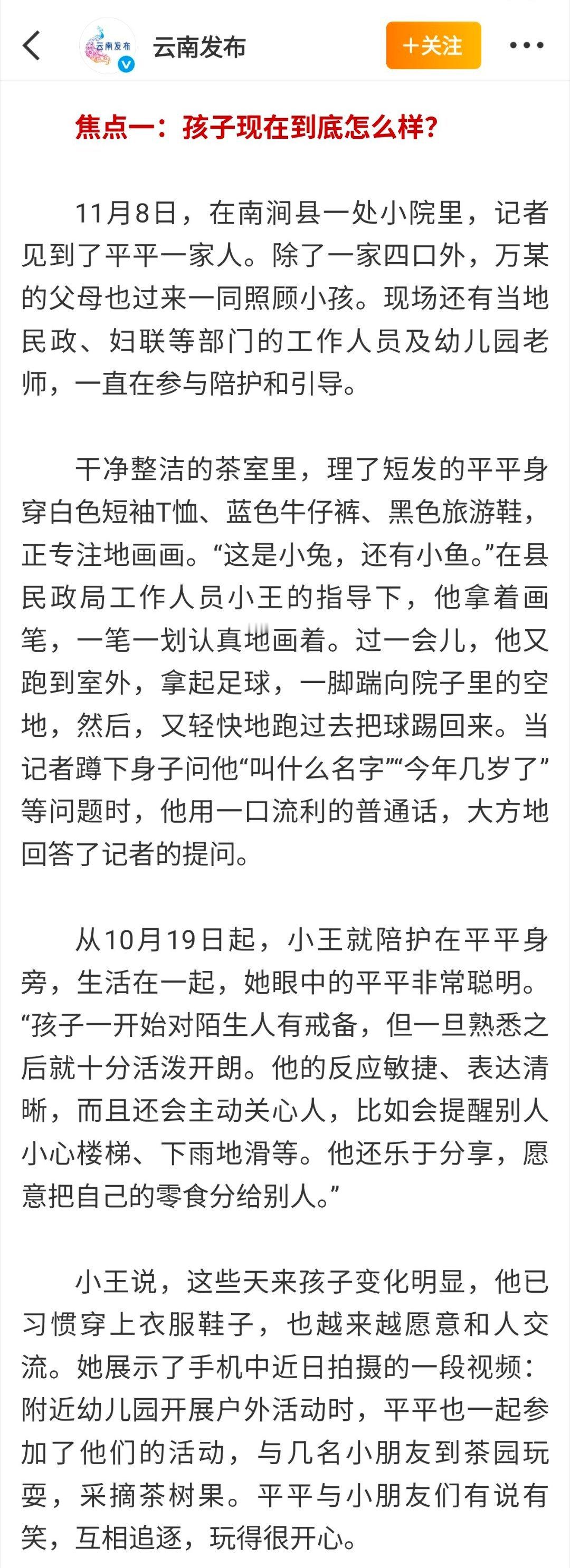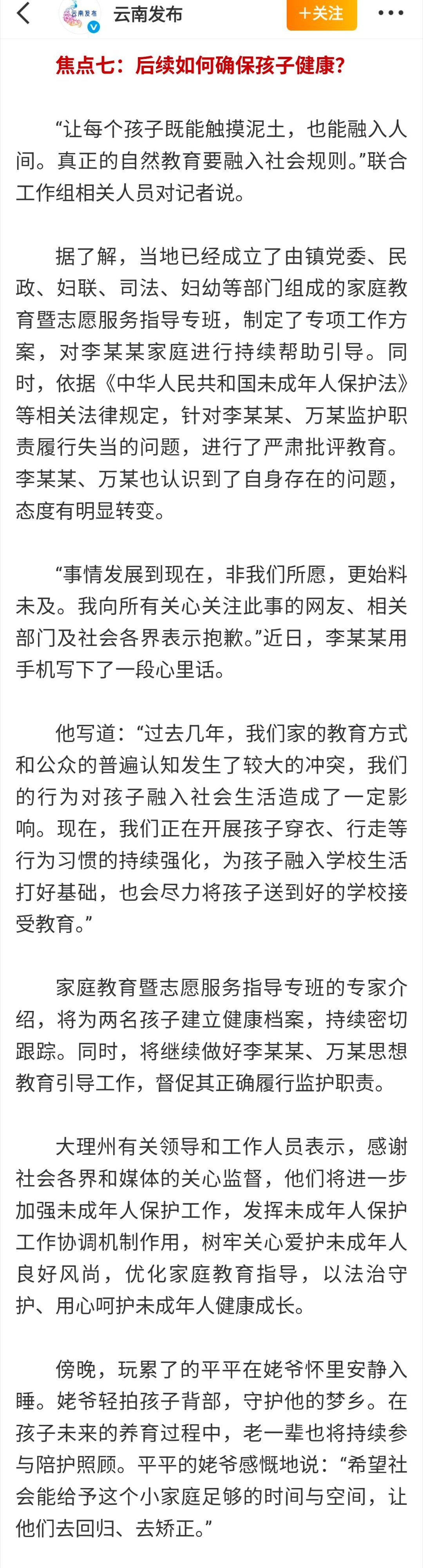 截止10月20日之后再也没野人小孩的相关消息,不负众望今天云南通报赤裸小孩事件进展,所谓网友爆料云南赤裸小孩并无虐待情况,让大家舒了一口气。遗憾的是李某某和万某(孩子父母)至今未达成共识登记结婚,并且平平、安安都是在家自然分娩未曾获取《出生医学证明》导致落户搁置,应该也没有按照相关规定给孩子打疫苗,并且今年长子平平已经3岁即将上幼儿园,相关部门的工作依然任重而道远!