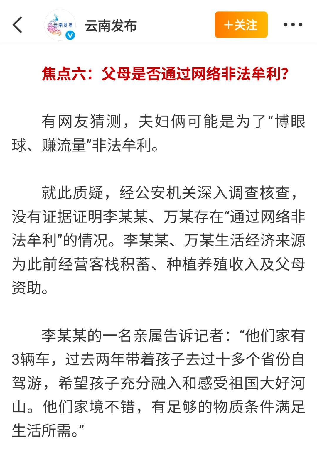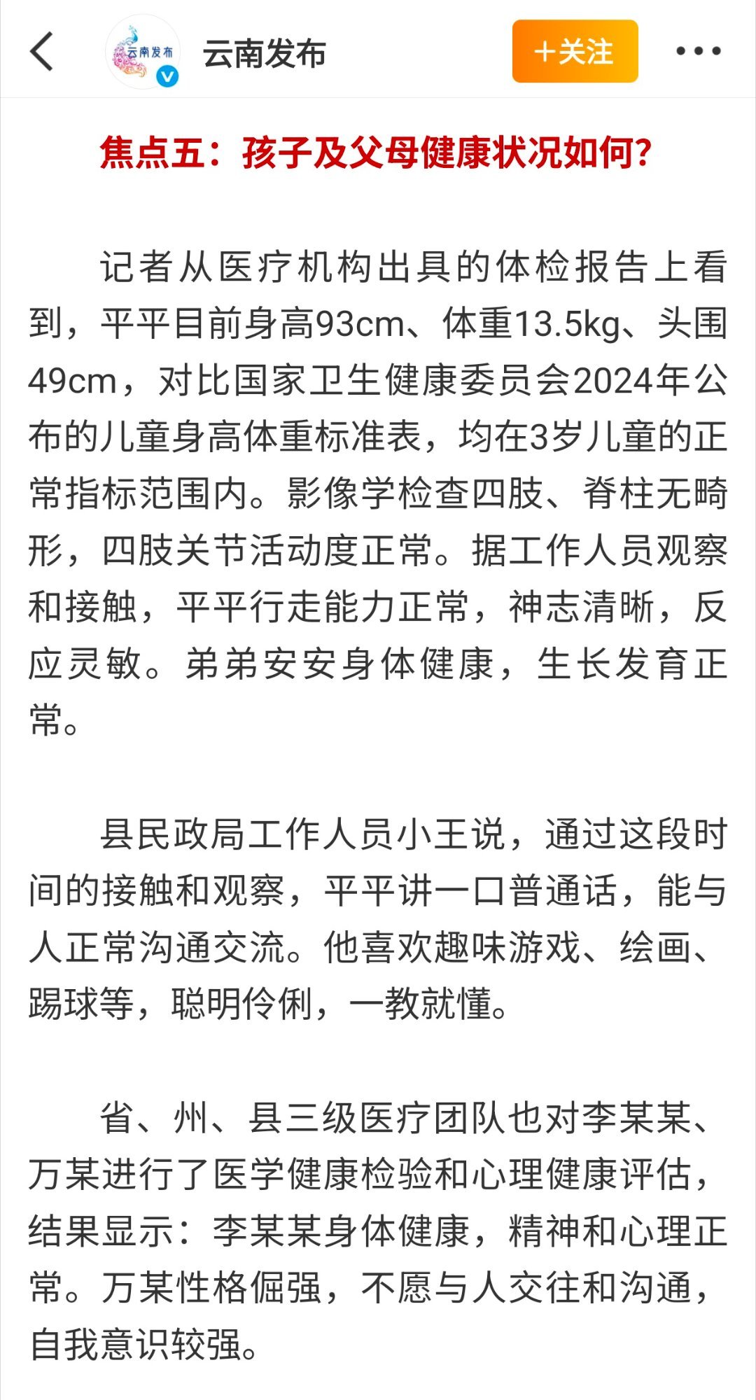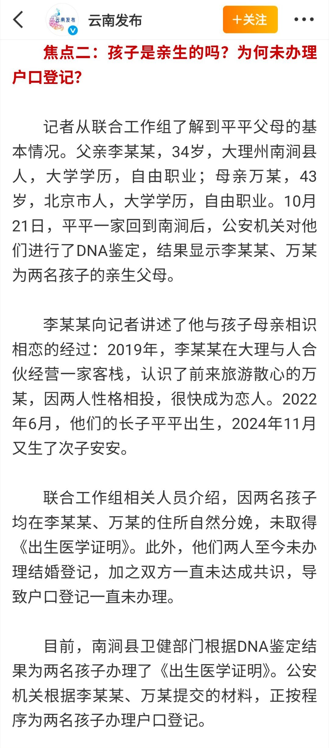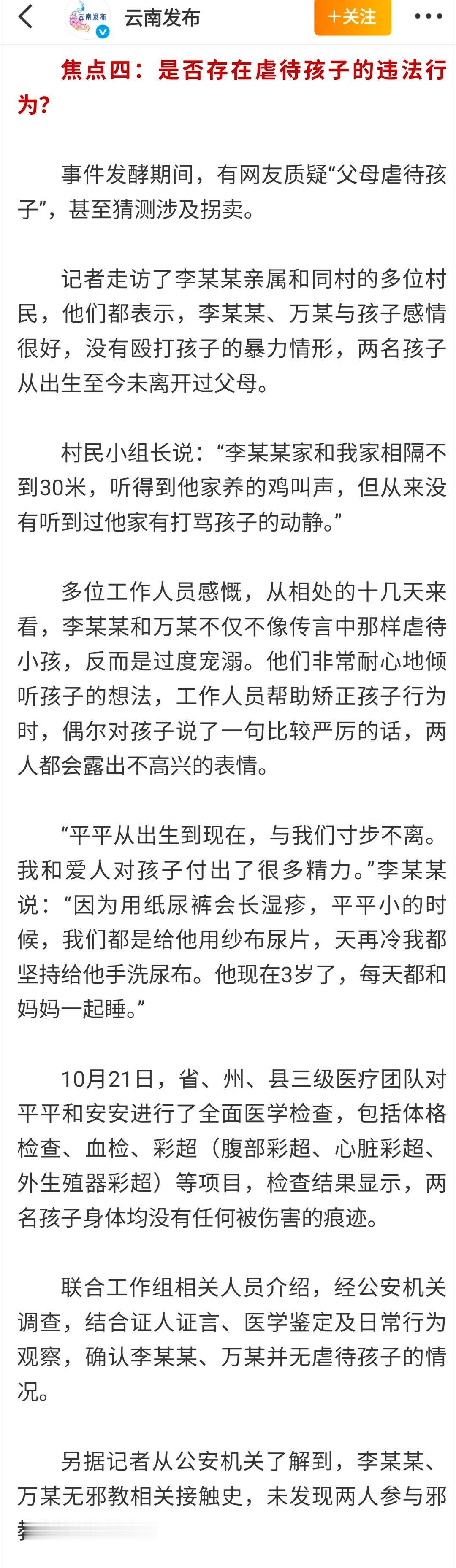 截止10月20日之后再也没野人小孩的相关消息,不负众望今天云南通报赤裸小孩事件进展,所谓网友爆料云南赤裸小孩并无虐待情况,让大家舒了一口气。遗憾的是李某某和万某(孩子父母)至今未达成共识登记结婚,并且平平、安安都是在家自然分娩未曾获取《出生医学证明》导致落户搁置,应该也没有按照相关规定给孩子打疫苗,并且今年长子平平已经3岁即将上幼儿园,相关部门的工作依然任重而道远!