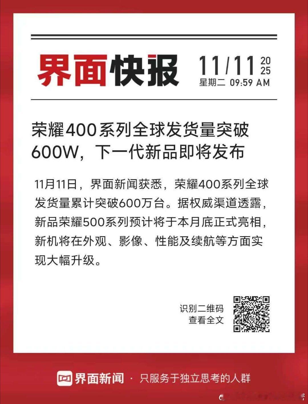 荣耀400能达到这个销量不意外,是市场对荣耀这种踏踏实实做产品的理念的认可;荣耀500应该会更猛。之前刷到荣耀500的各种爆料,标准版都上了旗舰芯片,续航也是同档位最大,期待一下