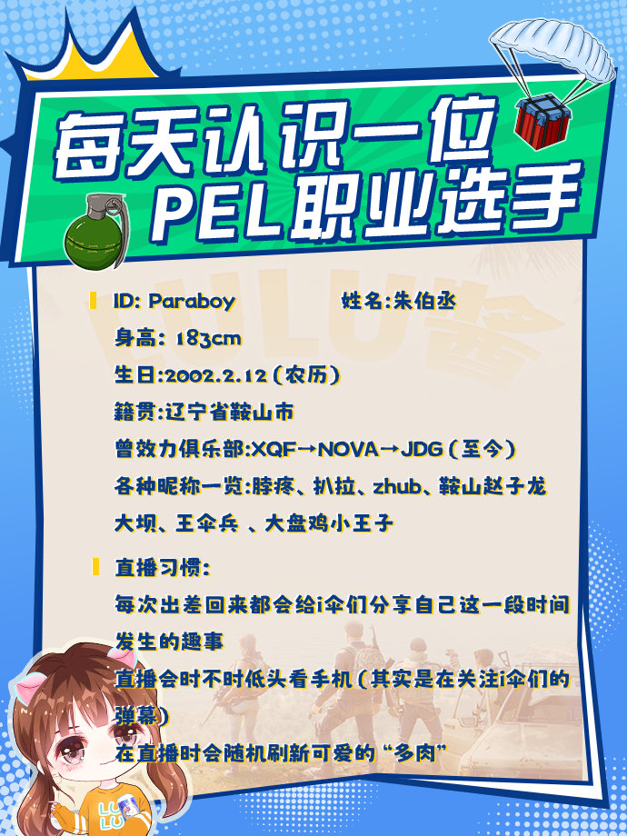 【每天认识一位PEL选手】——Paraboy✨姓名:朱伯丞📝ID:Paraboy⏰生日:2002年二月十二(农历)☔称呼:伞兵、小伞、脖疼、大坝、扒拉boy👕战队:北京JDG战队(2024年6月至今),曾效力于厦门XQF、NV-XQF、NV腾讯视频战队🌟队友:NV时期队友有酷酷、令、居米、皇儿等;JDG时期队友有苏楠、导师、咚咚等(部分)🎯运动状态:现役 (北京JDG)🥏运动项目:和平精英职业联赛、亚运会电竞和平精英项目🏆生涯荣誉:2023年杭州亚运会电竞和平精英项目金牌(担任队长)PMGC全球总决赛冠军(2020、2021)PEC和平精英国际冠军杯冠军(2019、2020)PEL联赛冠军(2020 S2、2021 S3)TGA腾讯电竞运动会总决赛和平精英项目冠军(2019)2021 Esports Awards“年度最佳手游选手”(首位中国得主)PEL首批名人堂成员(2024,以96分排名第一)2024微博之夜“年度影响力电竞选手”2025PEL春季赛常规赛“最佳架枪位”(部分荣誉)-📺经典比赛:2023年10月1日进行的杭州亚运会电竞和平精英项目决赛中,朱伯丞担任队长,带领中国队以44分36秒 943的成绩夺得金牌,这是亚运会史上首枚电竞项目金牌之一。2020年PMGC全球总决赛,朱伯丞帮助NV-XQF以319分夺冠,实现PEL+PEC+PMGC大满贯,成为PEL首位大满贯选手。-🕹️相关事件:2020年7月,原厦门XQF俱乐部被NV战队收购,朱伯丞随队更名为NV-XQF战队,开启“紫金王朝”时代。2022年9月,获得首批“电子竞技员”职业技能等级证书。2024年6月24日,朱伯丞转会至北京JDG战队,开启职业生涯新挑战。2024 年 12 月:入选 PEL 首批名人堂,以 96 分排名第一,成为联赛历史标杆人物。2025年1月22日,参加央视网络春晚,演唱歌曲《这世界我拼过》,推动电竞文化破圈。-🎥趣闻评价:朱伯丞被评价为“理想型电竞运动员”,纪录片《一竞到底》记录其职业历程,展现“逆境翻盘”的电竞精神。2023年从二指操作改为四指操作的自我革新,也体现了他对职业的极致追求和自律态度。2021年,Paraboy荣获Esports Awards“年度最佳手游选手”,成为首位获此殊荣的中国选手。这一奖项不仅是对他个人实力的认可,更标志着中国电竞选手正式登上世界舞台中央。凭借“天才选手+阳光形象”的双重加持,Paraboy已成为电竞圈的“顶流代言人”,手握11个品牌合作,覆盖电竞、时尚、快消等多个领域。他多次登上《时尚先生》等主流杂志封面,参与综艺节目录制,用实际行动打破电竞与大众文化的壁垒,成为“电竞偶像化”的标杆人物。