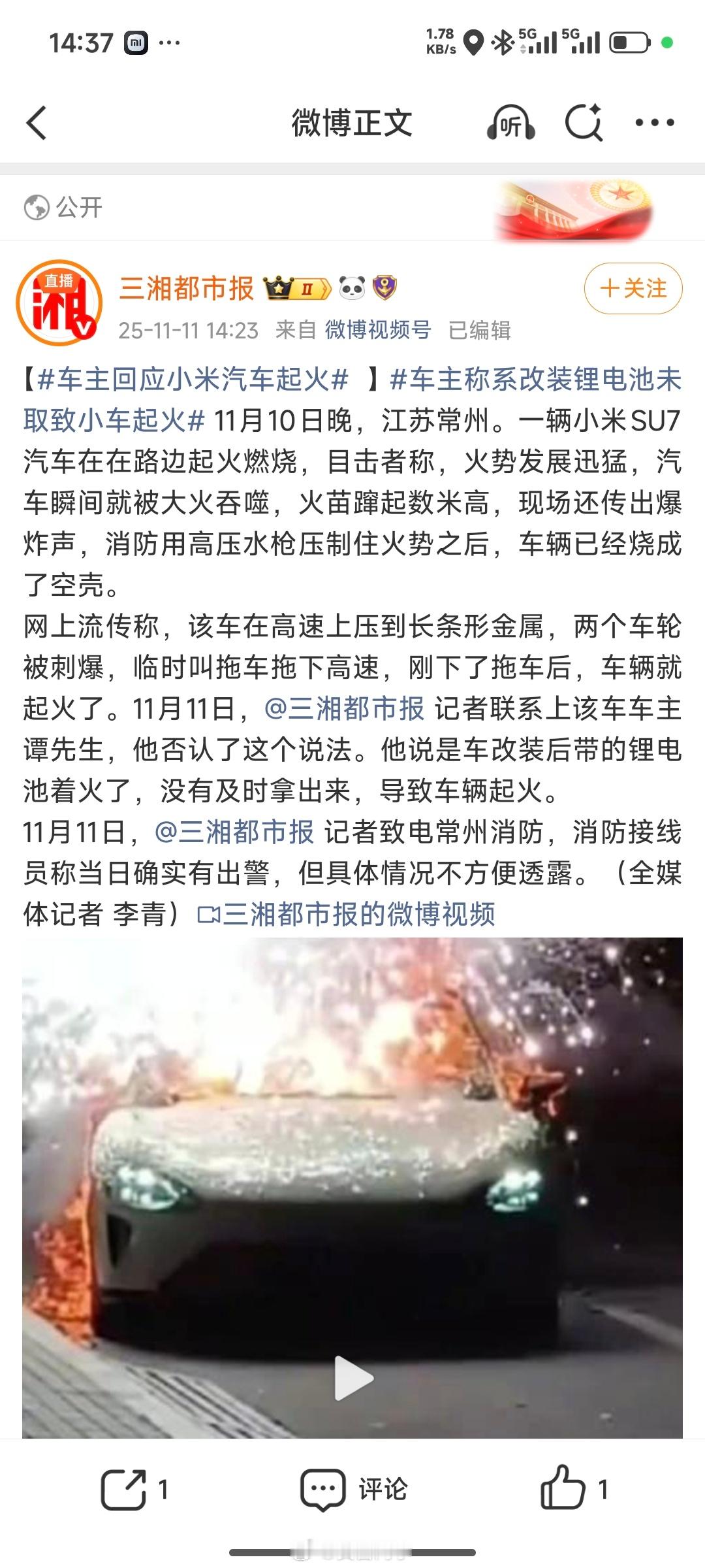 人没事儿就好,车辆起火原因涉及车主改装,锂电池未取导致的起火。早上那些什么群聊,我也在群里说,等相关通报。群聊自从上次友商事件后,不可信了
