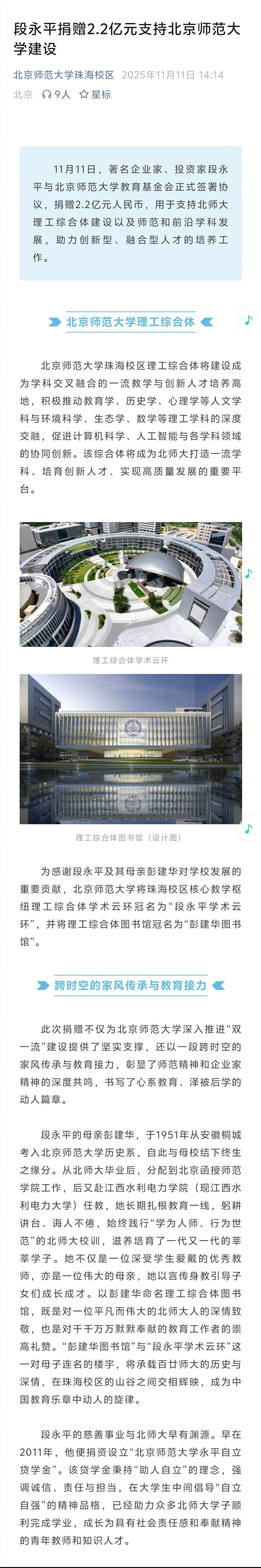 段永平捐赠2.2亿元支持北京师范大学建设,是真的。